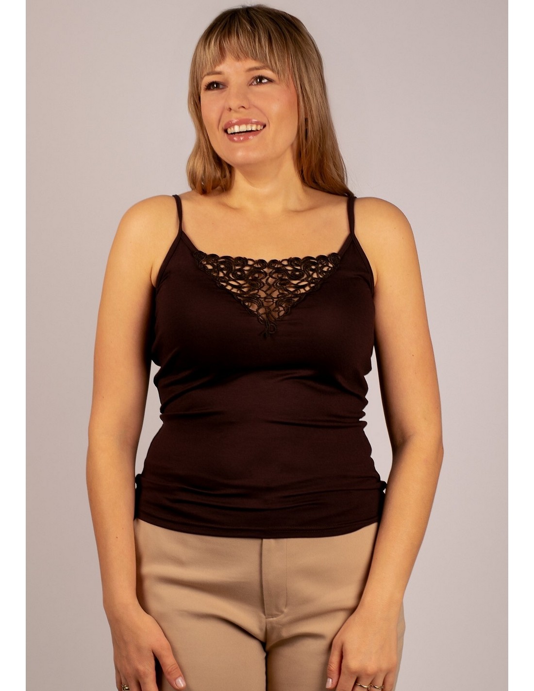 - dekolt zdobi efektowna gipiura