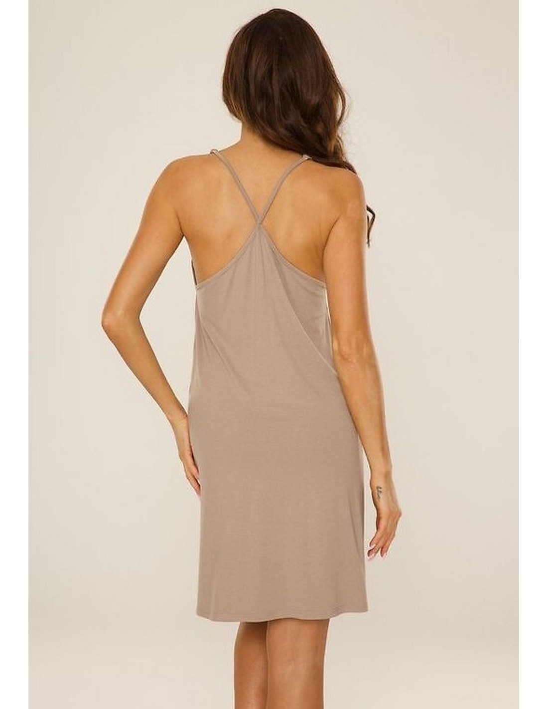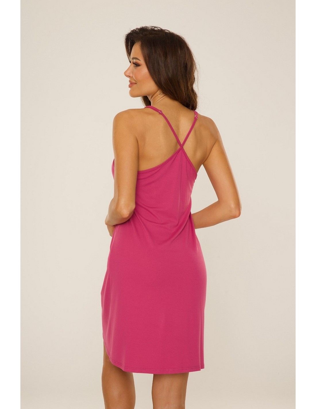 Koszula damska na cienkich regulowanych ramiączkach, zaplatanych na plecach. Dekolt w serek wykończony siateczką, długość koszuli przed kolano.