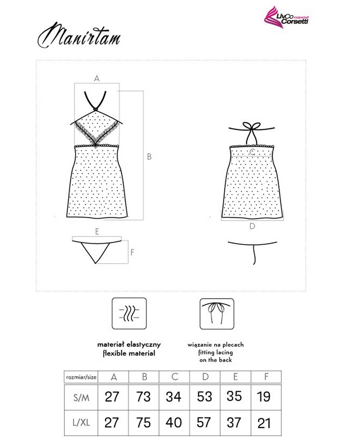 Dwuczęściowy zestaw bielizny Manirtam od producenta LivCo Corsetti Fashion. Składa się z prześwitującej koszulki z wycięciami na bokach oraz majtek typu stringi. Całość prezentuje się bardzo sensualnie. Każda pani w zestawie nocnej bielizny Manirtam będzie prezentować się wyjątkowo. Krótka koszulka kończy się w górnej części ud. Poprzez swoje koronkowe wykończenie i prześwitujący materiał jest jednocześnie sekowana i elegancka. To propozycja dla odważnych kobiet, które chcą się wyróżnić. Skład materiału sprawia, że tkanina jest lekko elastyczna i dopasowuje się do kształtów ciała. Komplet jest dostępny w dwóch rozmiarach s/m oraz l/xl. Swobodna forma koszulki, sprawia, że mogą ją nosić kobiety o różnym typie sylwetki. Głeboki czarny kolor zestawu oraz materiał w drobne kropeczki sprawiają, że dwuczęściowy komplet bielizny Manirtam prezentuje się jednocześnie wytwornie i dziewczęco. To dobra propozycja także na randkę, jak i spokojny wieczór, gdy chcemy podkreślić, zakładając piękną bieliznę.