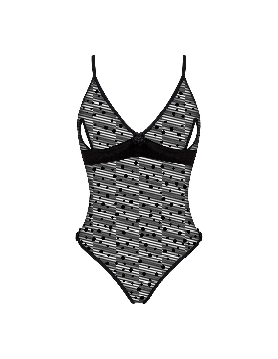 Amalia teddy to uwodzicielskie body, które łączy delikatność i zmysłowość. Wykonane z transparentnej siateczki zdobionej figlarnymi kropkami, idealnie podkreśla kobiece kształty.