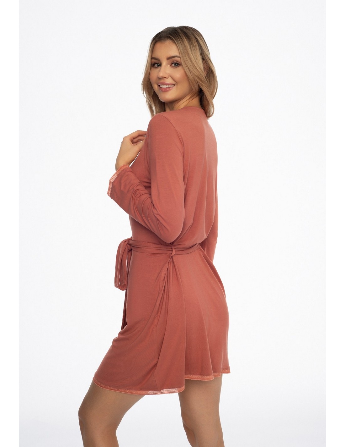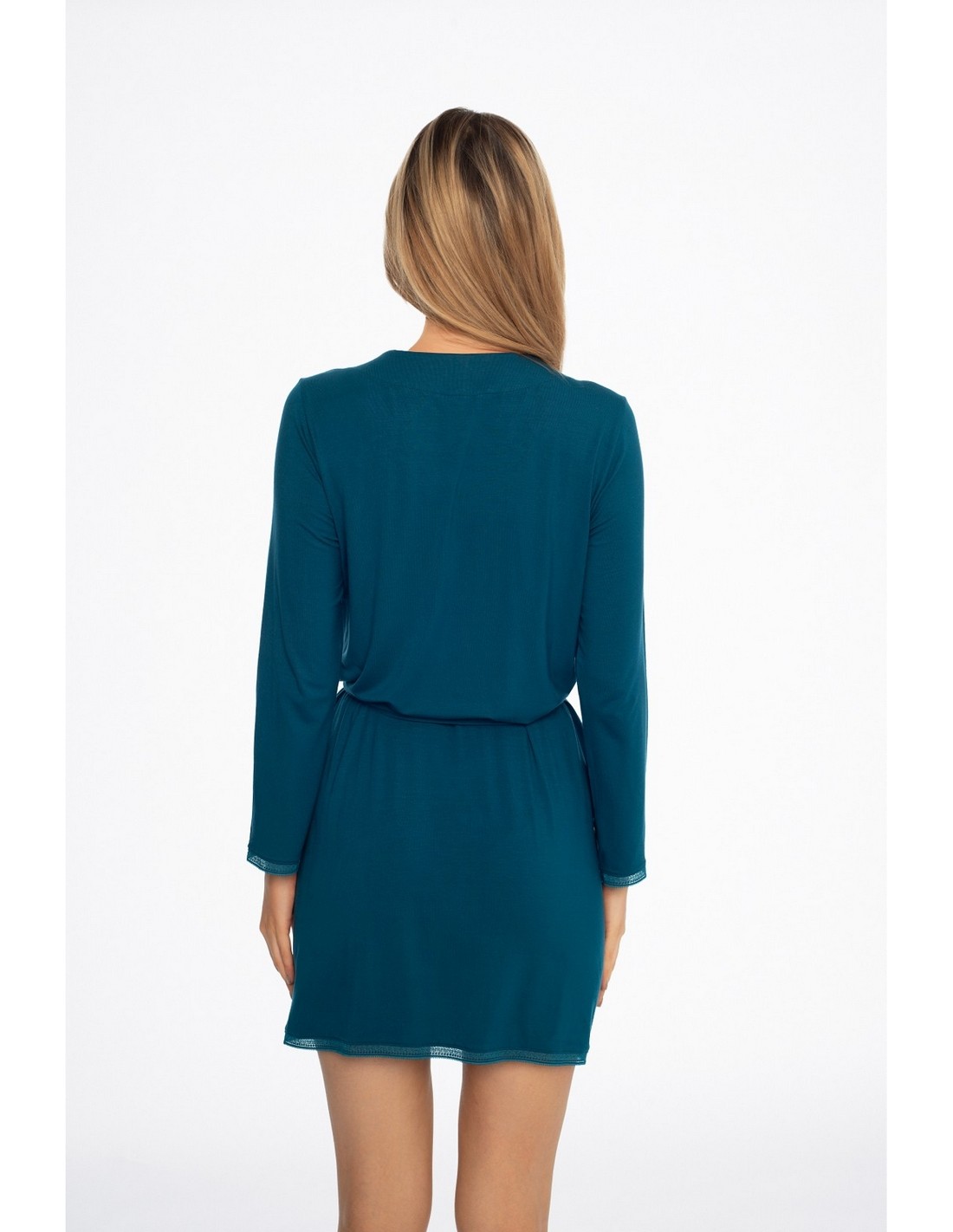 Szlafrok Alena 41315 SS24 Henderson charakteryzuje się cienkim, krótkim krojem oraz długimi rękawami, co zapewnia komfort podczas noszenia. Wykonany z delikatnej wiskozy, jest lekki i przewiewny, idealny na ciepłe wieczory. Dodatkowo, szlafrok ma wygodne kieszenie na biodrach oraz wiązanie w pasie, co pozwala na regulację dopasowania. Dół szlafroka oraz rękawy zostały obszyte koronką, co dodaje mu elegancji i subtelności. To doskonały wybór na relaksujący wieczór w domowym zaciszu.
