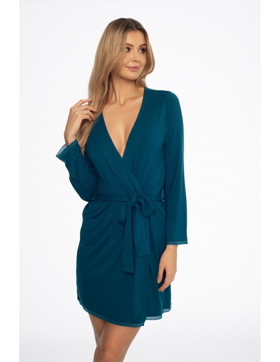Szlafrok damski Alena 41315 SS24 Henderson to lekki i elegancki dodatek do bielizny nocnej. Wykonany z delikatnej wiskozy, idealny na wieczór. Długie rękawy i koronkowe wykończenia podkreślają kobiecość.
