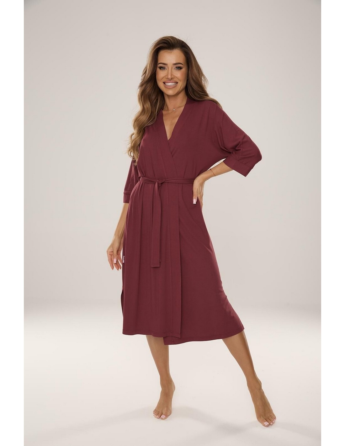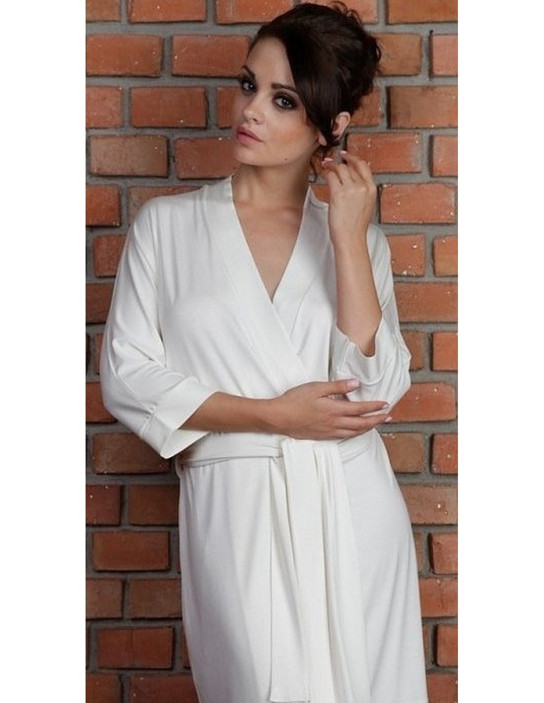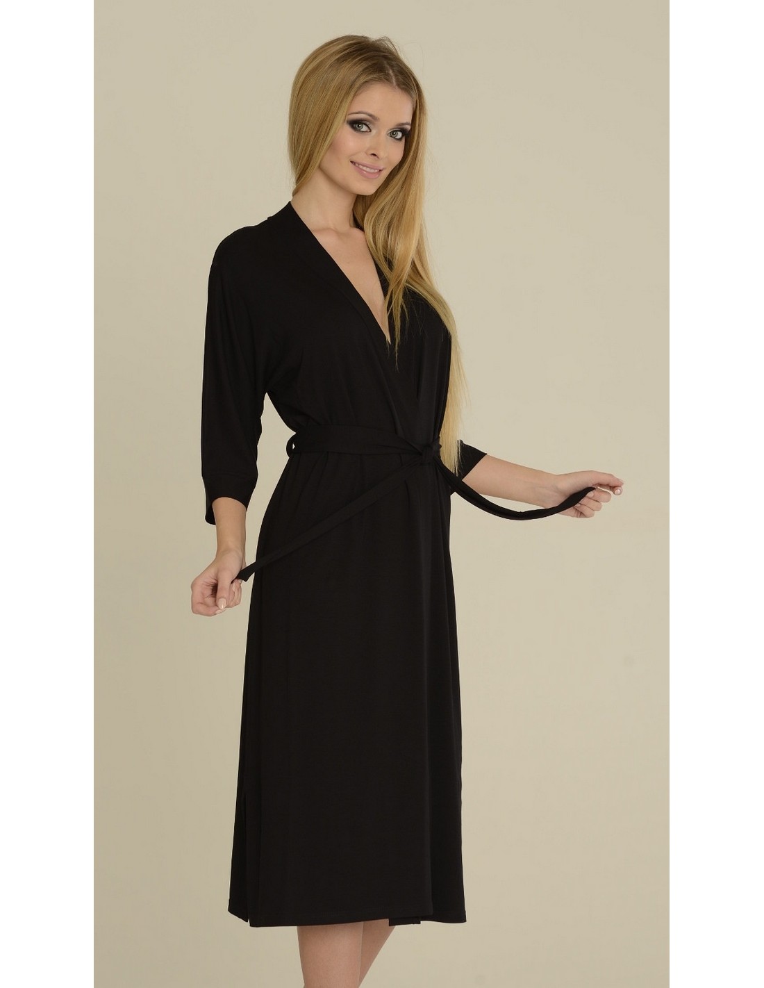 Długi szlafrok damski wykonany z wysokogatunkowej wiskozy. Model ten jest cienki posiada rękawy o długości 3/4 oraz jest wiązany w pasie.