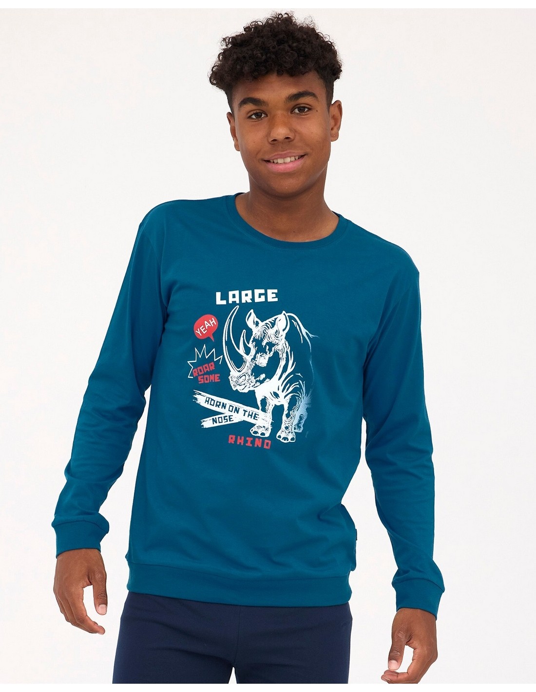 Piżama chłopięca uszyta z wysokiej jakości miękkiej bawełny. Koszulka z długim rękawem, przód ozdobiony kolorowym nadrukiem.