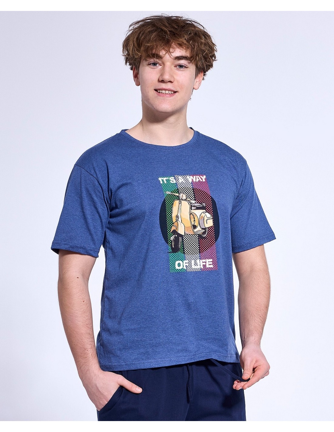 Piżama młodzieżowa uszyta z wysokiej klasy miękkiej bawełny. Koszulka jest z krótkim rękawem, przód ozdobiony kolorowym nadrukiem.