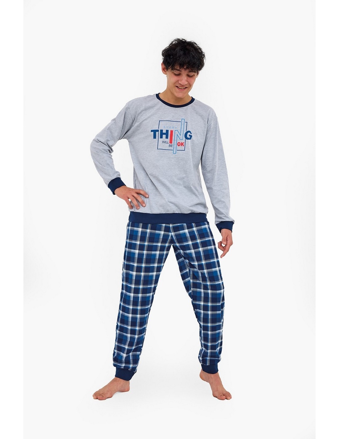 Młodzieżowa piżama chłopięca THING, bluza z długim rękawem, gładka z nadrukiem i spodniami w kratę. 100% bawełna, komfortowe ściągacze, pudełko prezentowe.