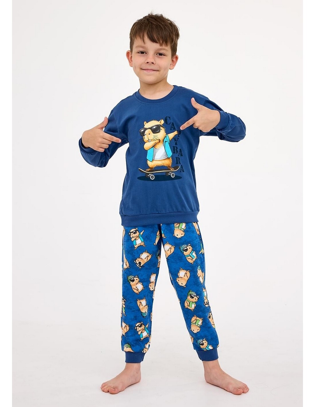Piżama chłopięca DR 593/177 CAPYBARA to połączenie wygody, klasy i uroczego wzornictwa. Wykonana w 100% z miękkiej, oddychającej bawełny, gwarantuje komfort i swobodę ruchów podczas snu.