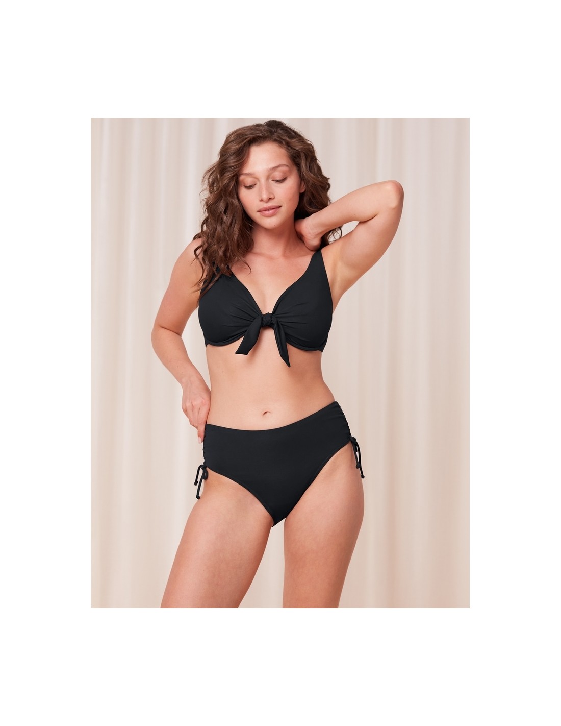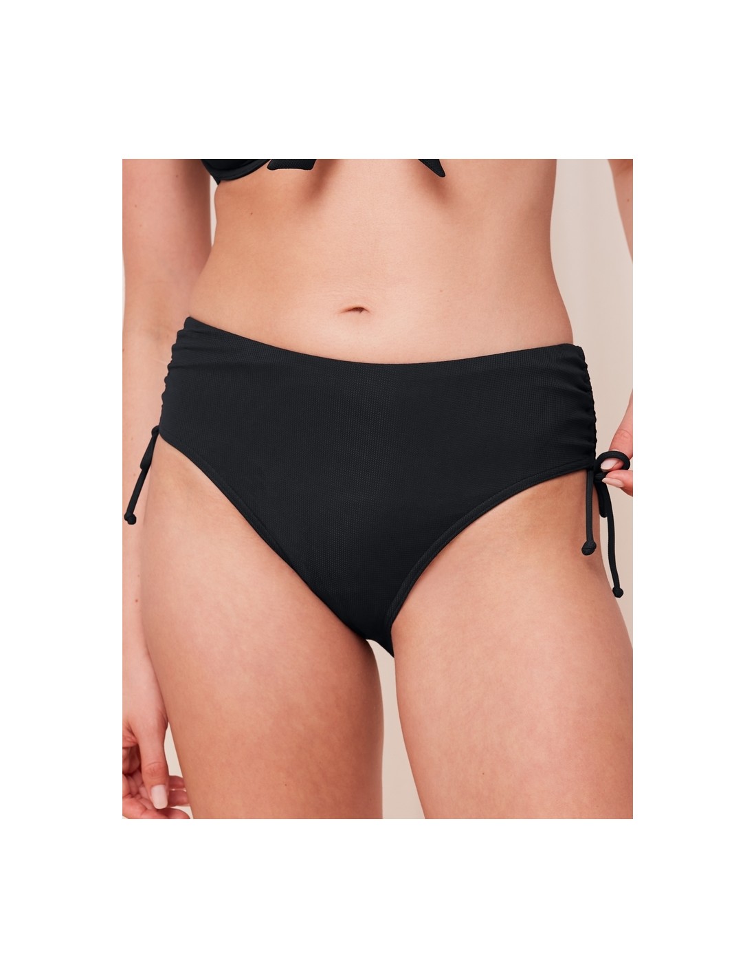 The high-waist bikini bottoms are designed with style and comfort in mind, providing full coverage and a flattering look. Their high-waist design gently shapes the figure, while the mesh panel on the tummy adds subtle support. Adjustable strings on the sides allow you to adjust the width, giving the whole thing a personalized character. Made from recycled fabric, they are an elegant choice that combines aesthetics with care for the environment.