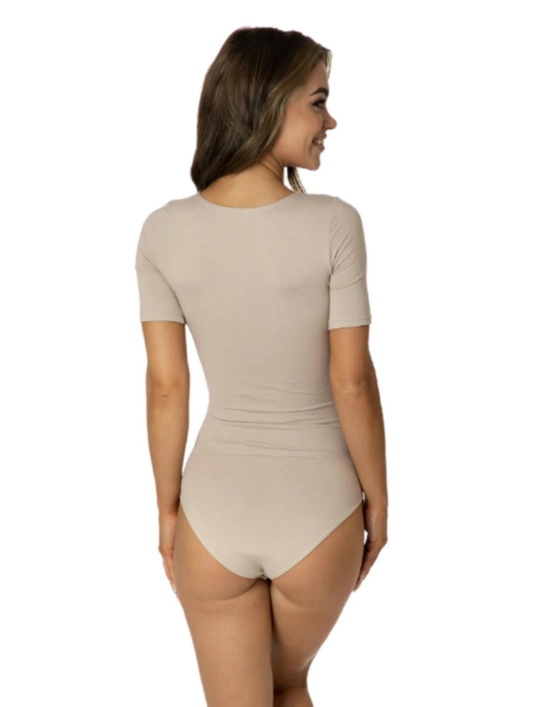 MODEL 5 is a one-piece swimsuit from the Plus Size collection. Its design and wide straps firmly support a larger bust, and the pattern delicately accentuates it. The single-colour bottom optically slims the figure, and a delicate slit adds femininity.