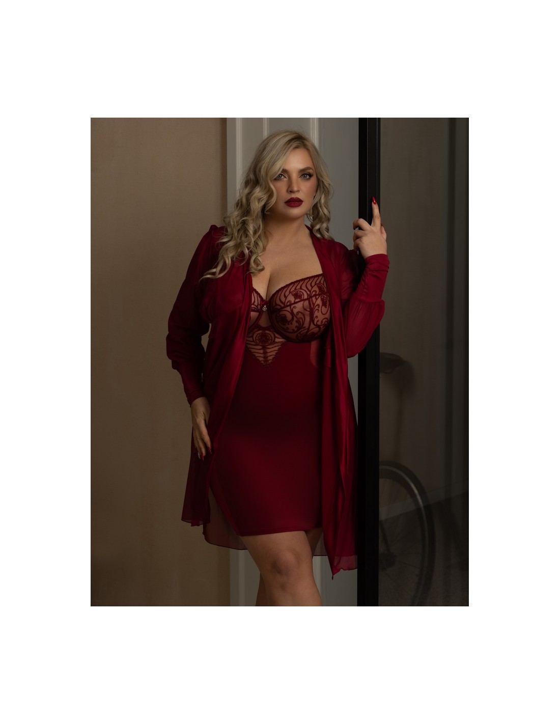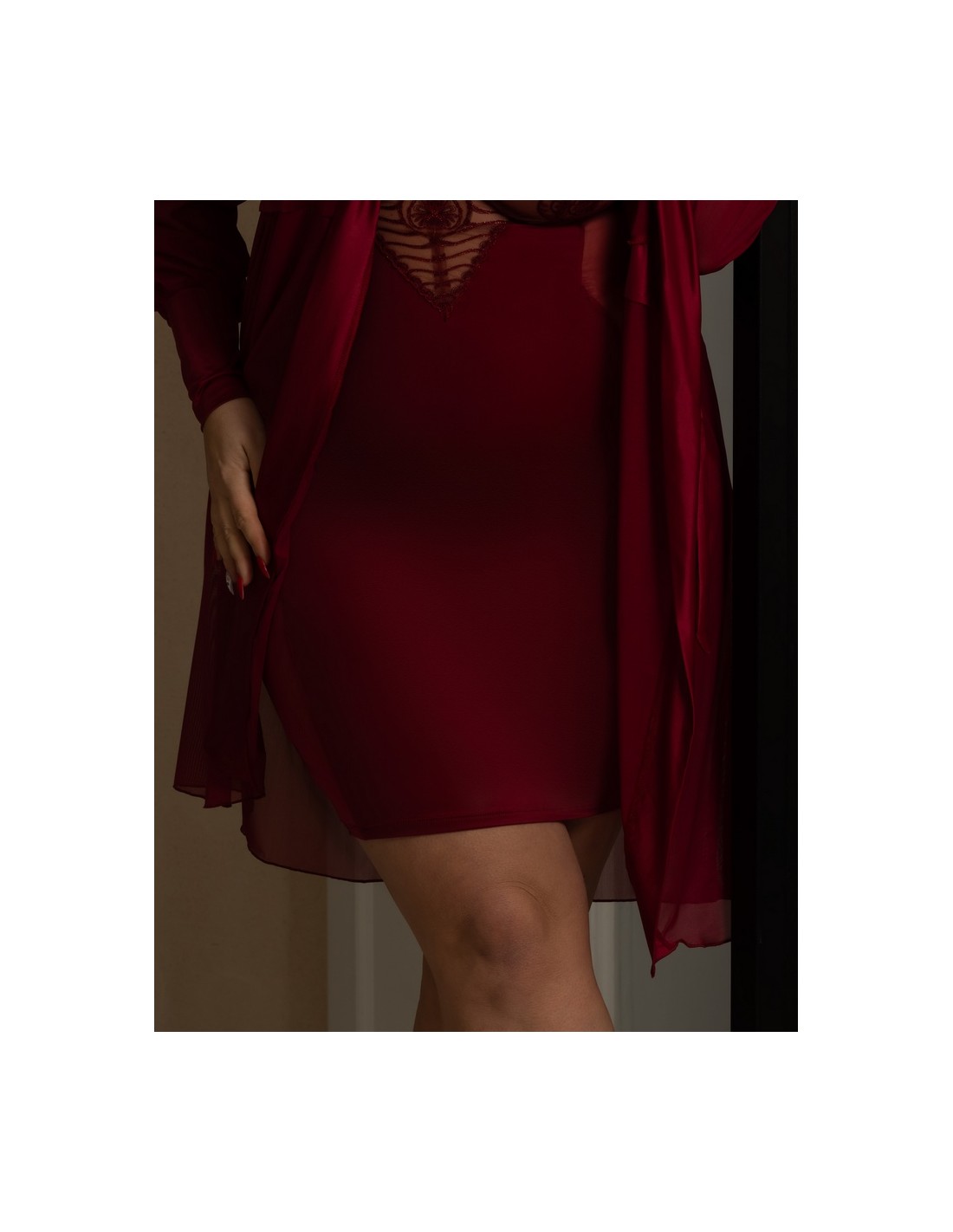 Sensual negligee in beautiful burgundy colors. The dressing gown is the perfect complement to the Rubin T-shirt.