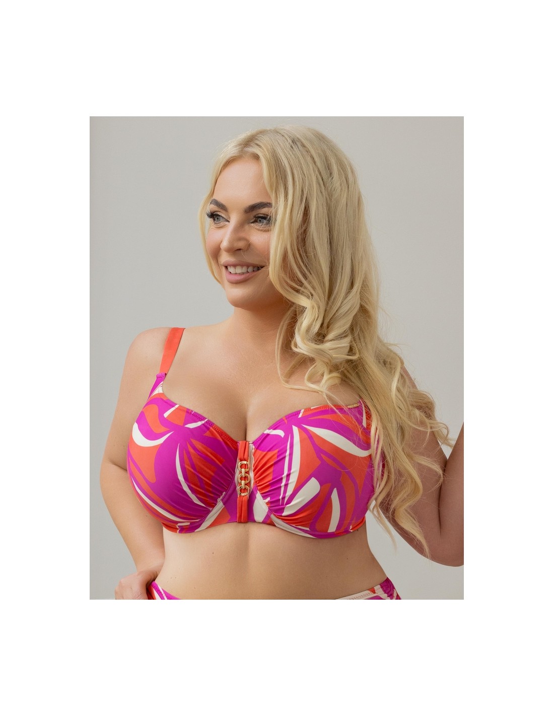 The Krisline Twist Roma swim bra is the perfect choice for women looking for comfort and support during summer days. The soft construction has been designed for medium and larger breasts, offering stability without sacrificing a feminine look. Cups with a side panel effectively shape the breasts and direct them towards the center, which allows for an attractive shape and a beautiful cleavage line. The smooth, one-piece surface of the cups not only elegantly presents the fabric pattern, but also provides a subtle, aesthetic look. The underwires add support while emphasizing natural shapes. This is a perfect combination of comfort, functionality and style. Material composition: 80% polyamide, 10% elastane, 10% polyester.
