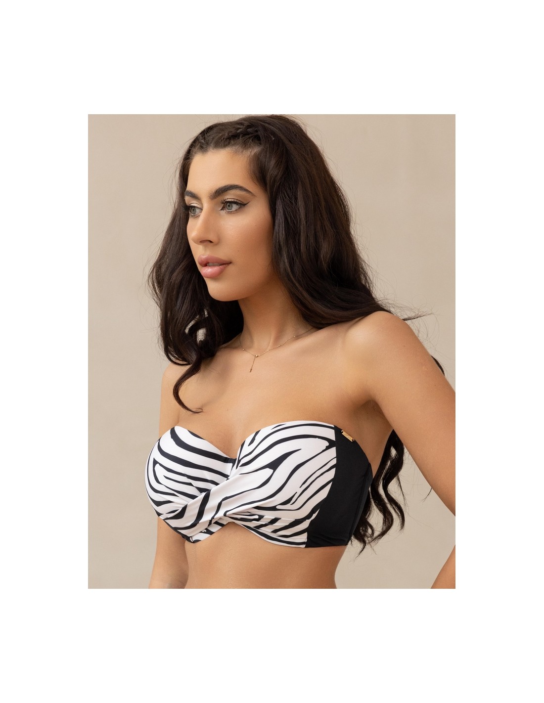 This swim bra from the collection inspired by elegance and luxury is a proposal for women who want to look phenomenal on the beach or by the pool. The carefully designed cup gently lifts the bust upwards, subtly exposing it and collecting it from the sides, which visually adds volume and emphasizes the natural shape of the breasts. The effective zebra pattern attracts attention and gives the whole thing a modern character. The model works best for small and medium-sized breasts, offering them ideal support and shaping. Detachable straps allow you to adjust the style to your style - worn classically, around the neck or completely without, which emphasizes the line of the shoulders and neckline. This is an exceptional choice for women who value quality, style and perfect finish. Composition: 80% polyamide, 10% elastane, 10% polyester.