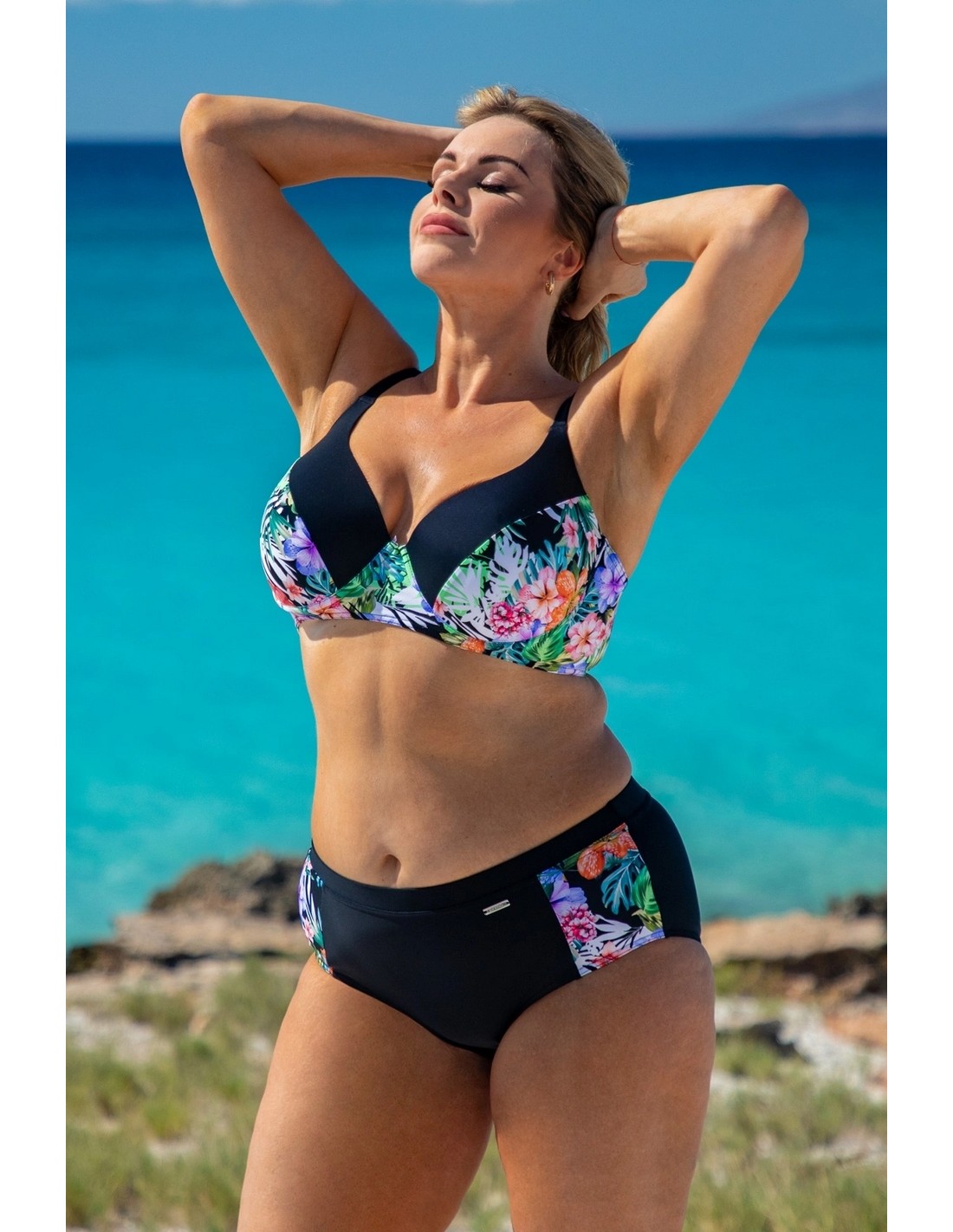 MODEL 147 is a two-piece swimsuit. The set consists of a bra with moulded cups on thick adjustable straps that perfectly support the bust and high-waisted panties with inserts that optically slim the figure.