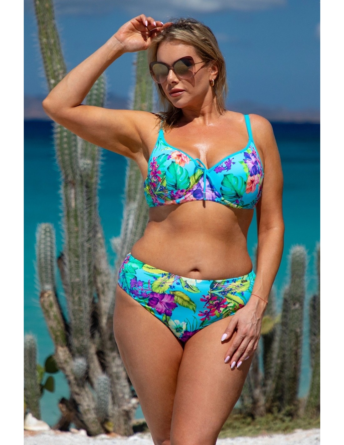 MODEL 5 is a one-piece swimsuit from the Plus Size collection. Its design and wide straps firmly support a larger bust, and the pattern delicately accentuates it. The single-colour bottom optically slims the figure, and a delicate slit adds femininity.