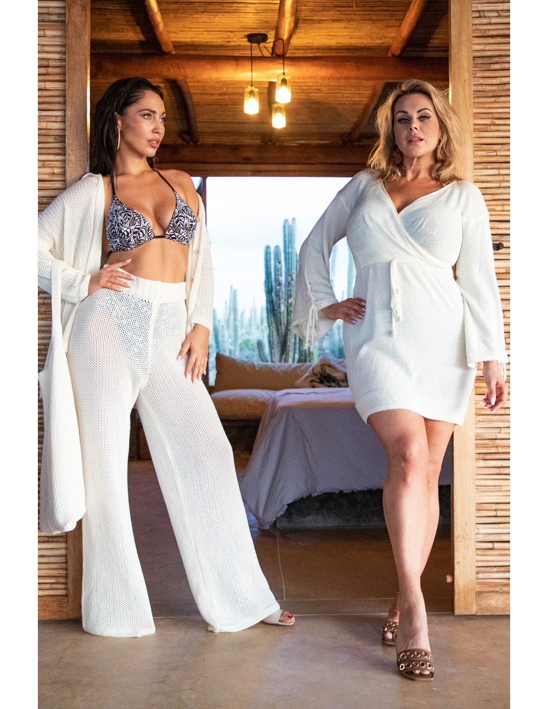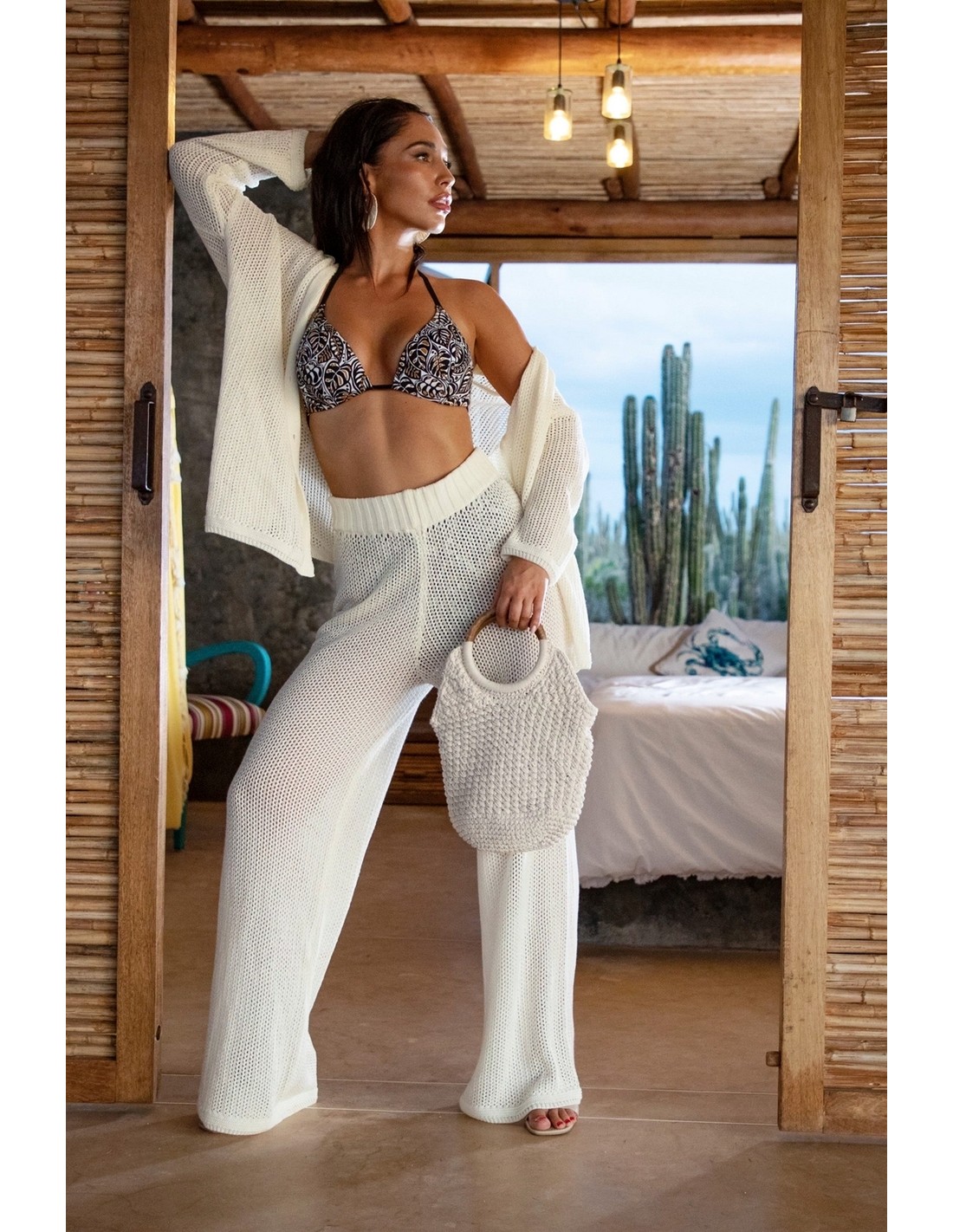 MODEL 5 is a one-piece swimsuit from the Plus Size collection. Its design and wide straps firmly support a larger bust, and the pattern delicately accentuates it. The single-colour bottom optically slims the figure, and a delicate slit adds femininity.