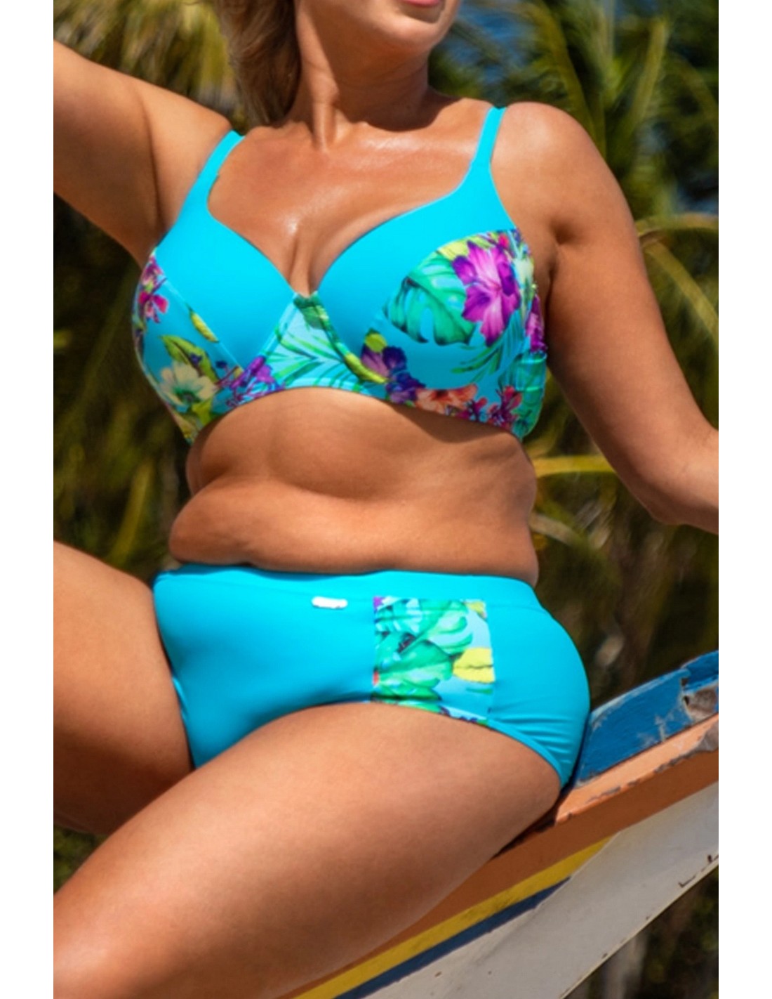 MODEL 147 is a two-piece swimsuit. The set consists of a bra with moulded cups on thick adjustable straps that perfectly support the bust and high-waisted panties with inserts that optically slim the figure.