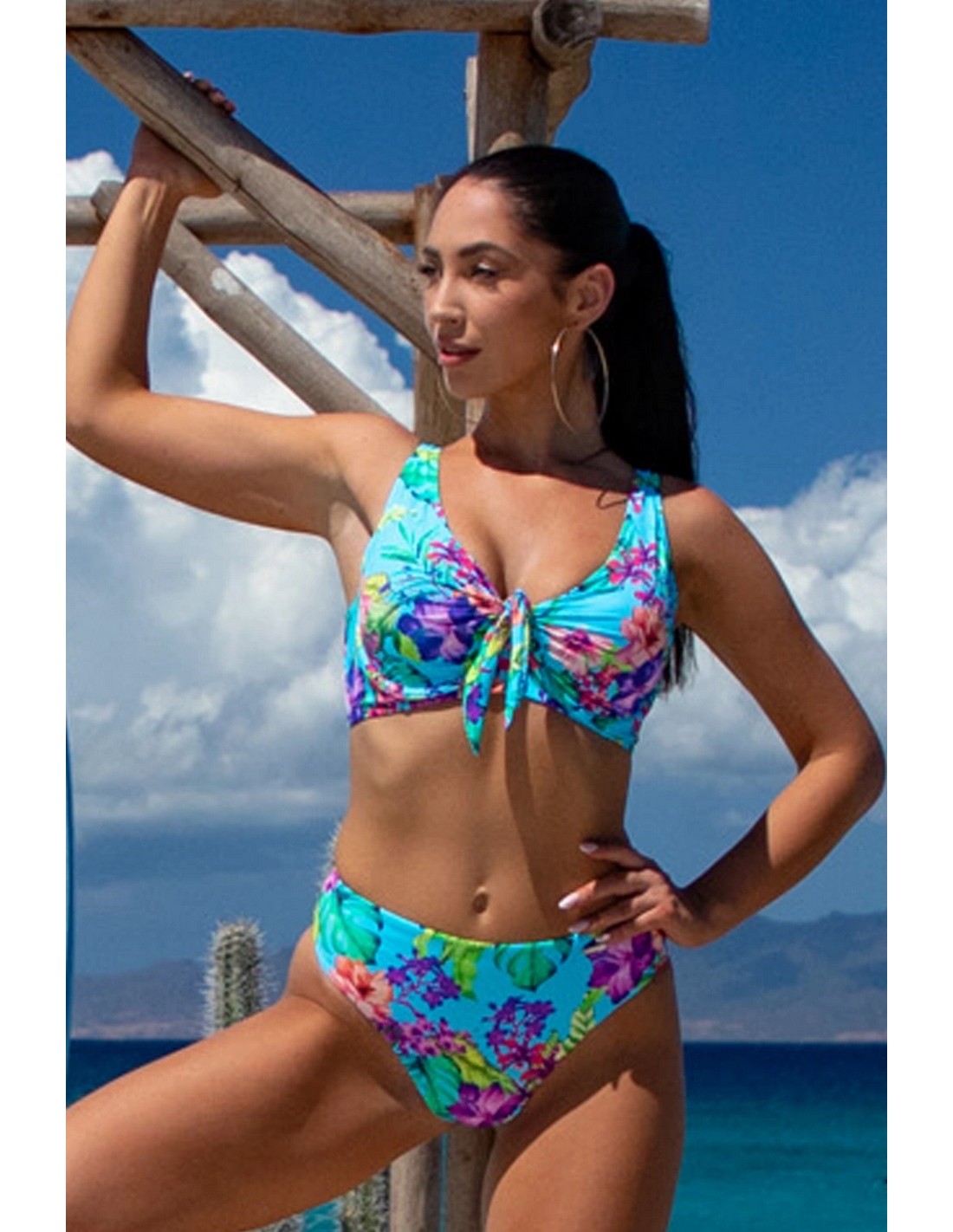 MODEL 5 is a one-piece swimsuit from the Plus Size collection. Its design and wide straps firmly support a larger bust, and the pattern delicately accentuates it. The single-colour bottom optically slims the figure, and a delicate slit adds femininity.