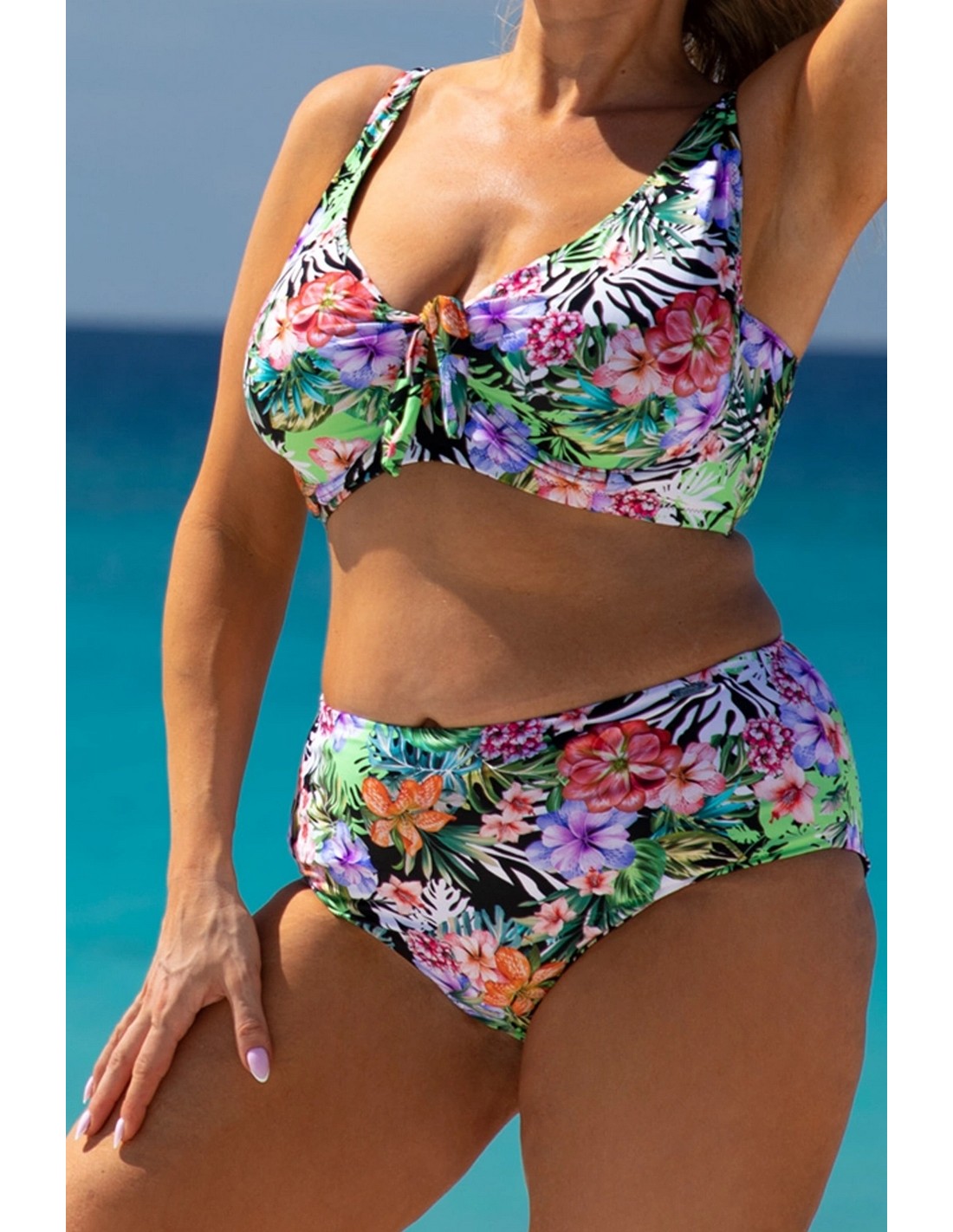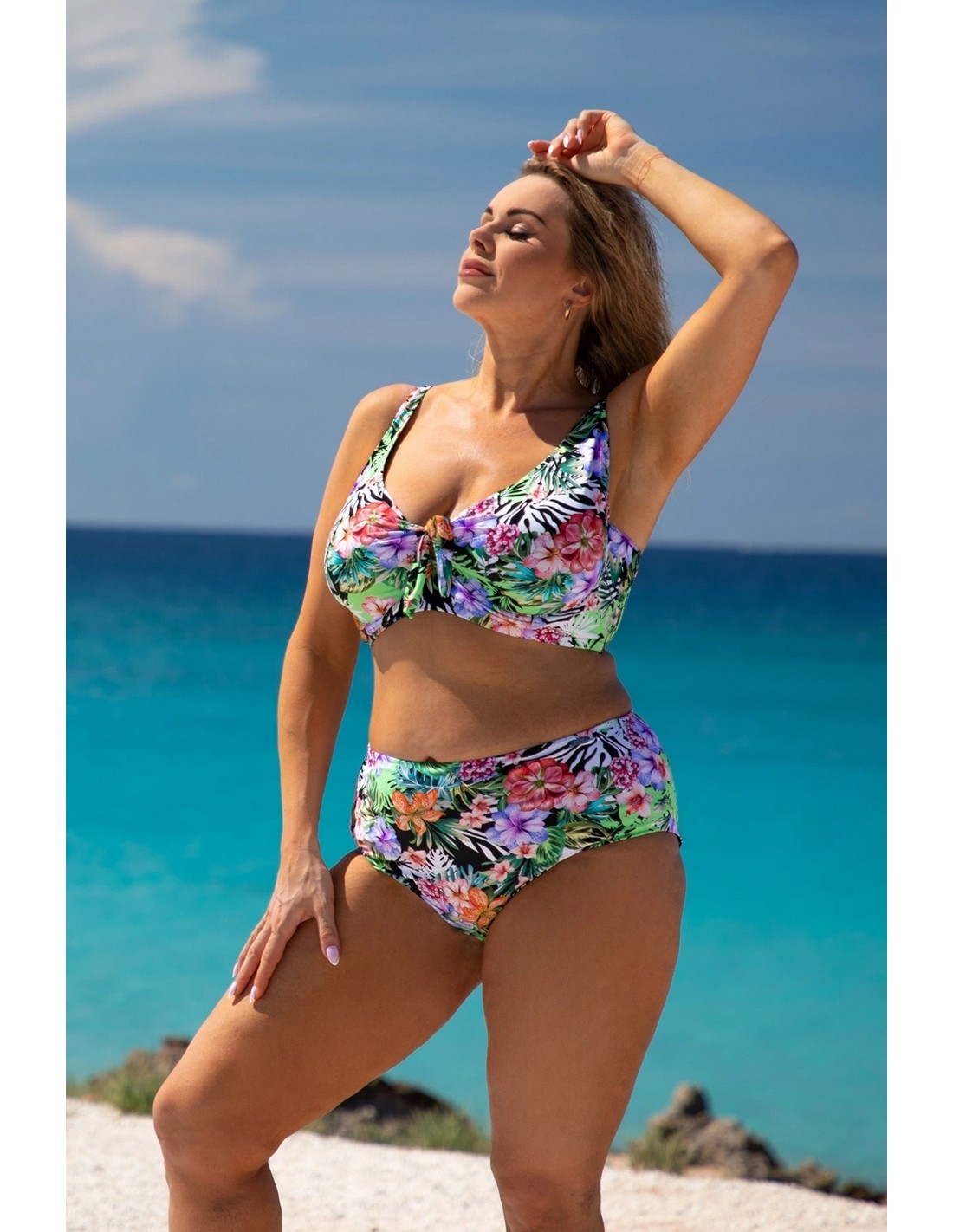 MODEL 5 is a one-piece swimsuit from the Plus Size collection. Its design and wide straps firmly support a larger bust, and the pattern delicately accentuates it. The single-colour bottom optically slims the figure, and a delicate slit adds femininity.