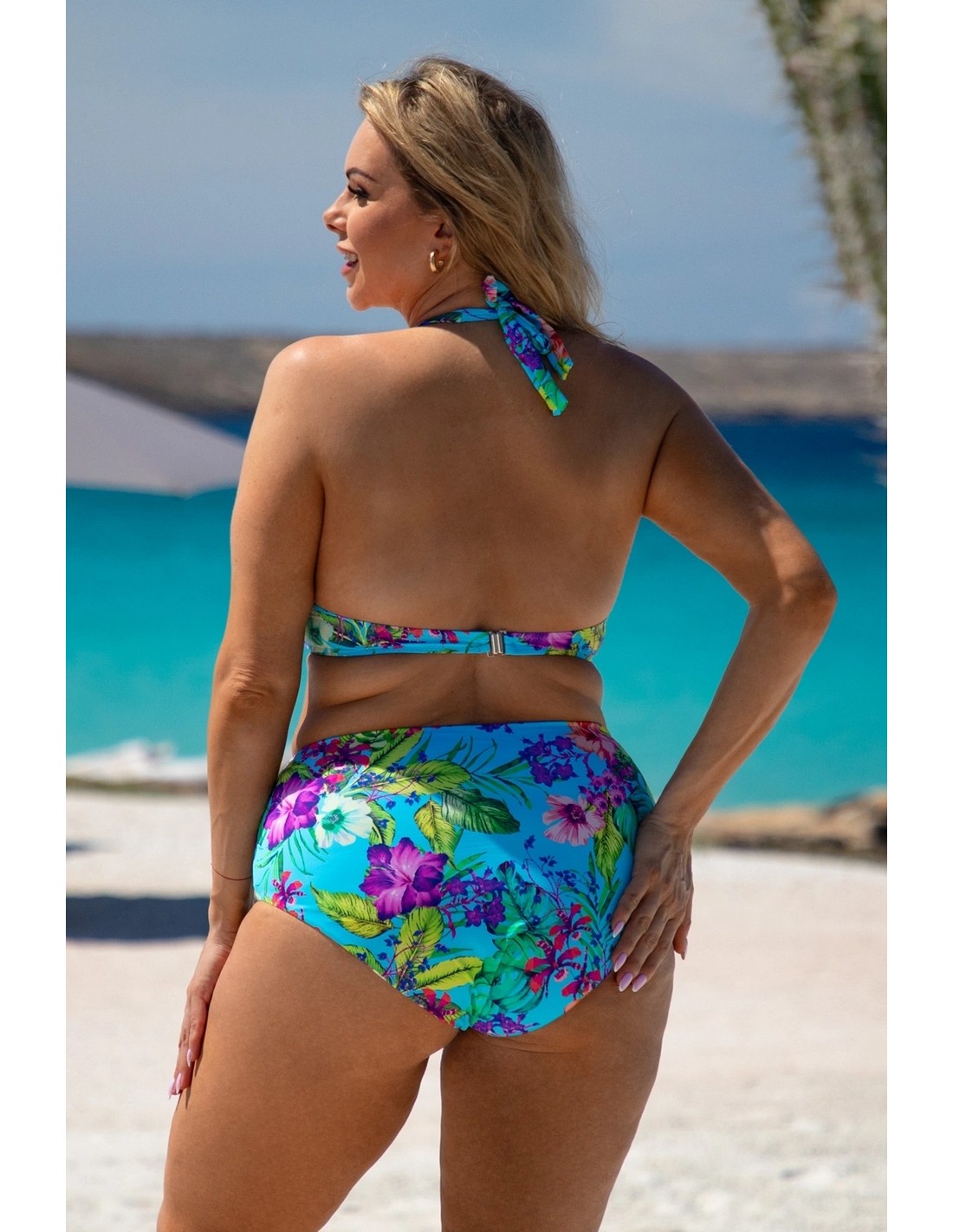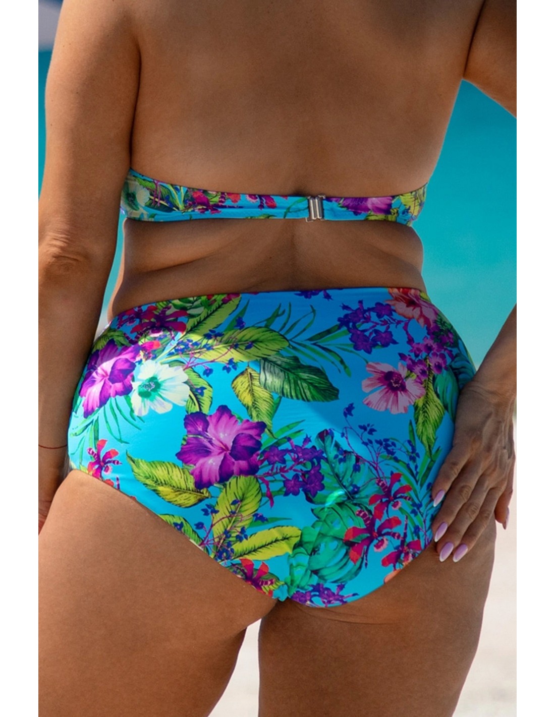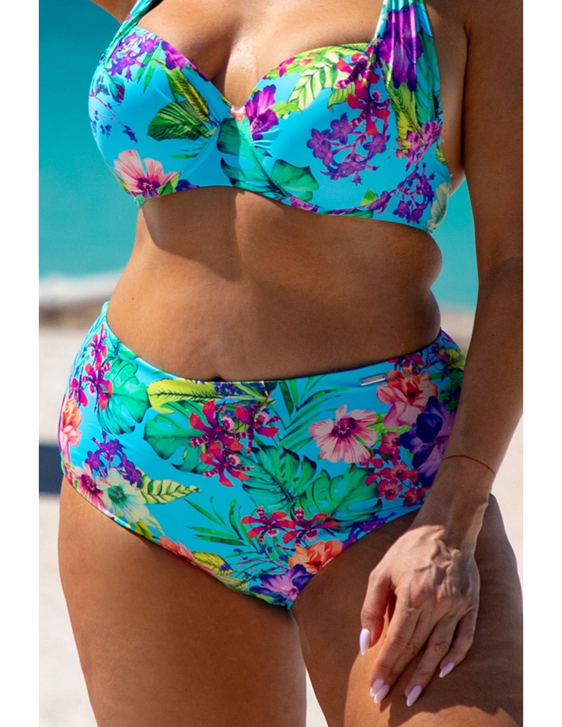 MODEL 5 is a one-piece swimsuit from the Plus Size collection. Its design and wide straps firmly support a larger bust, and the pattern delicately accentuates it. The single-colour bottom optically slims the figure, and a delicate slit adds femininity.