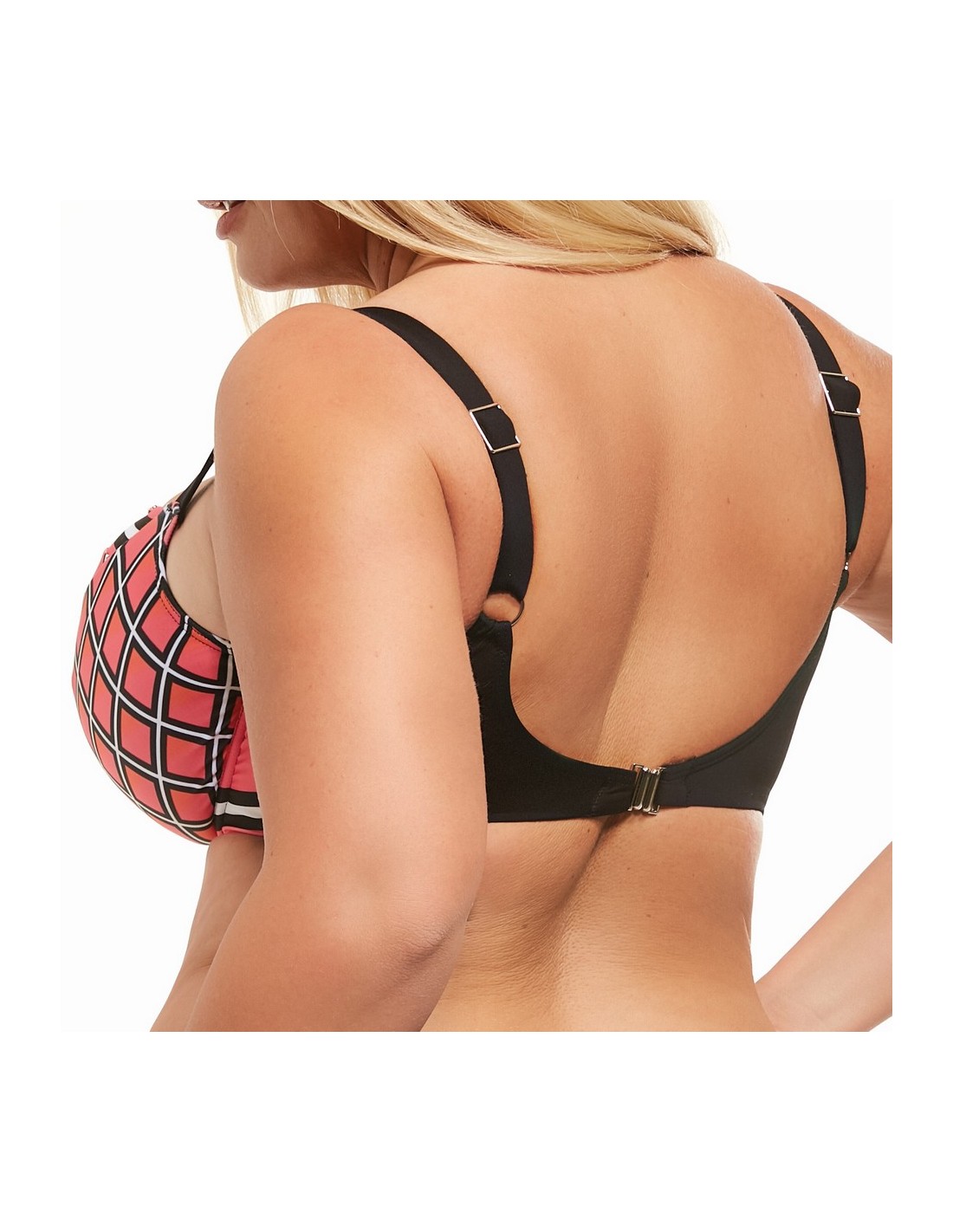 The perfect form of a soft Tanzania swim bra, it raises the breasts and characteristically collects the bust inside. Additional strengthening and comfort of wearing are guaranteed by side and bottom underwires as well as wide adjustable straps. The cups and bridge of the bra are made of patterned, colorful fabric, the back and straps of the bra are smooth and black. Straps width adjusted to the size, adjustable. The back is fastened with a traditional clip. Composition: 80% Polyamide, 10% Elastane, 10% Polyester.
