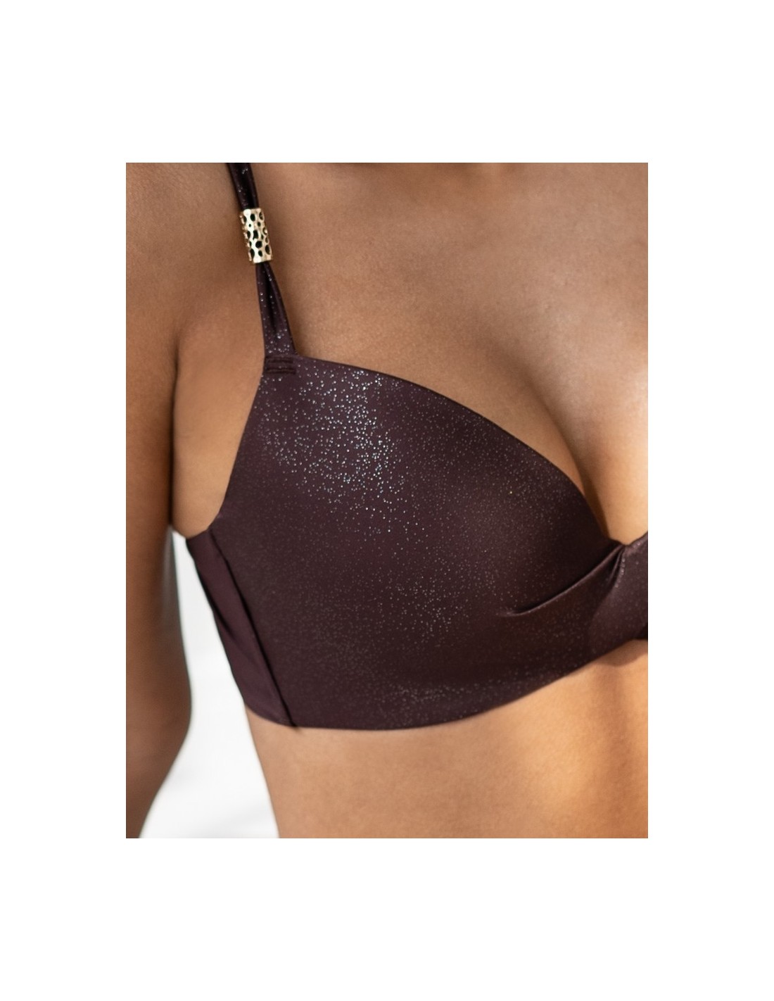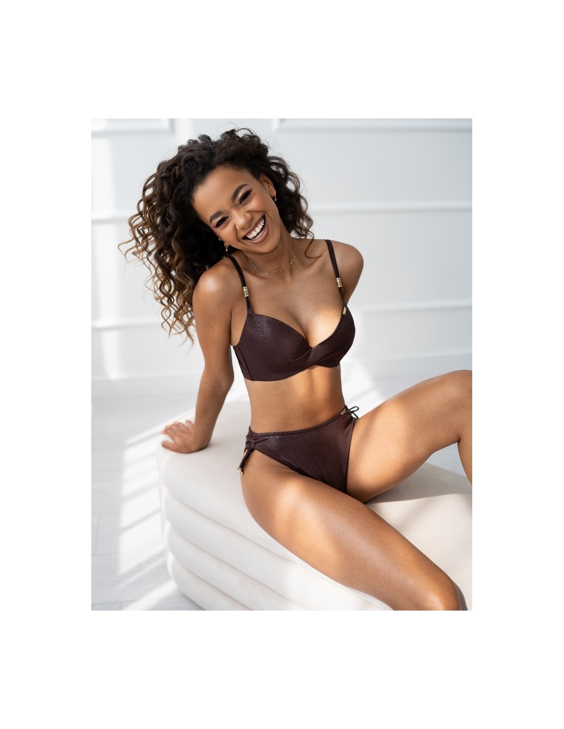 An unusual swim bra with a thermoformed cup that shapes and lifts the bust up giving a push-up effect. The bra is very comfortable and shapes the bust beautifully. This bra is designed with high-quality fabric in a beautiful brown color. The straps are beautifully decorated and adjustable in length, perfectly fitting small bust sizes. The bra is equipped with a traditional, slightly wider clip closure. We recommend swimming briefs from the same series to complete the set. Composition: 80% polyamide, 10% elastane, 10% polyester.