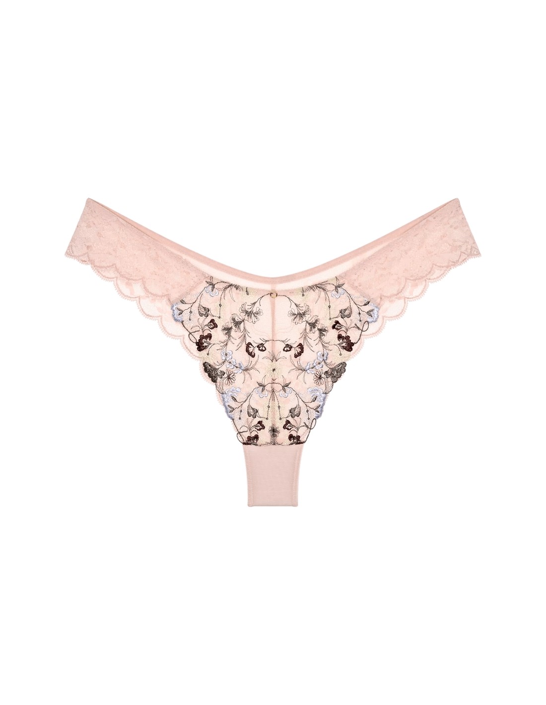 Refresh your lingerie collection with Brazilian panties that offer comfort and elegance. The high leg cut emphasizes the silhouette, while contrasting, colorful embroidery on the front and feminine lace on the back add a unique charm.