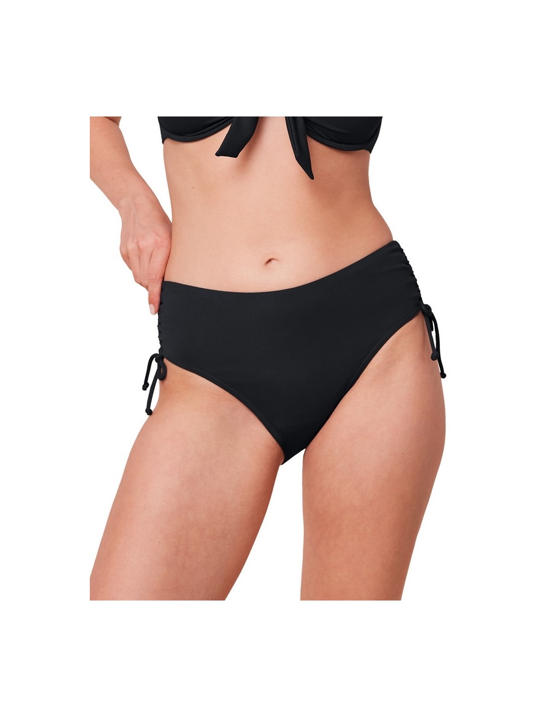 Wysokie majtki bikini zostały wykonane z myślą o stylu i wygodzie, zapewniając pełne krycie i ciekawy wygląd. Ich krój z wysokim stanem delikatnie modeluje sylwetkę, a siateczkowy panel na brzuchu dodaje subtelnego wsparcia. Regulowane sznurki po boczkach umożliwiają dopasować szerokość, nadając całości indywidualnego charakteru. Wyprodukowane z dzianiny uzyskanej z recyklingu, stanowią szykowny wybór, który łączy estetykę z troską o środowisko.