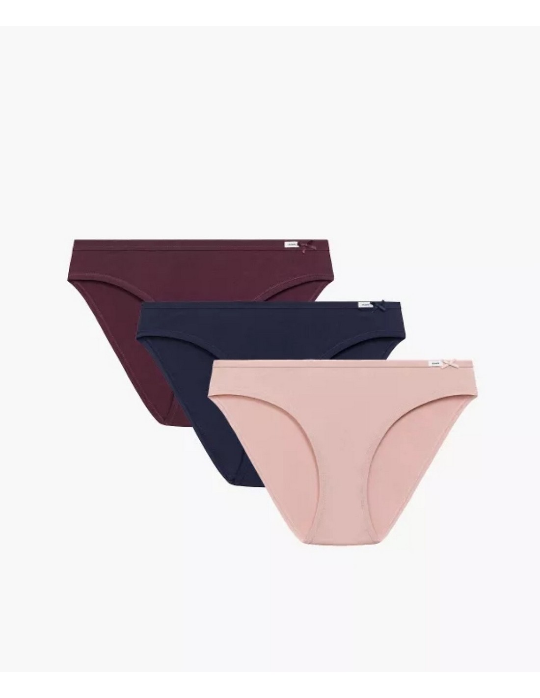 Figi damskie 3-PAK, o fasonie bikini, niski stan wykończony miękką lamówką, głęboko wycięte boki. Skład: 95% bawełna, 5% elastan.