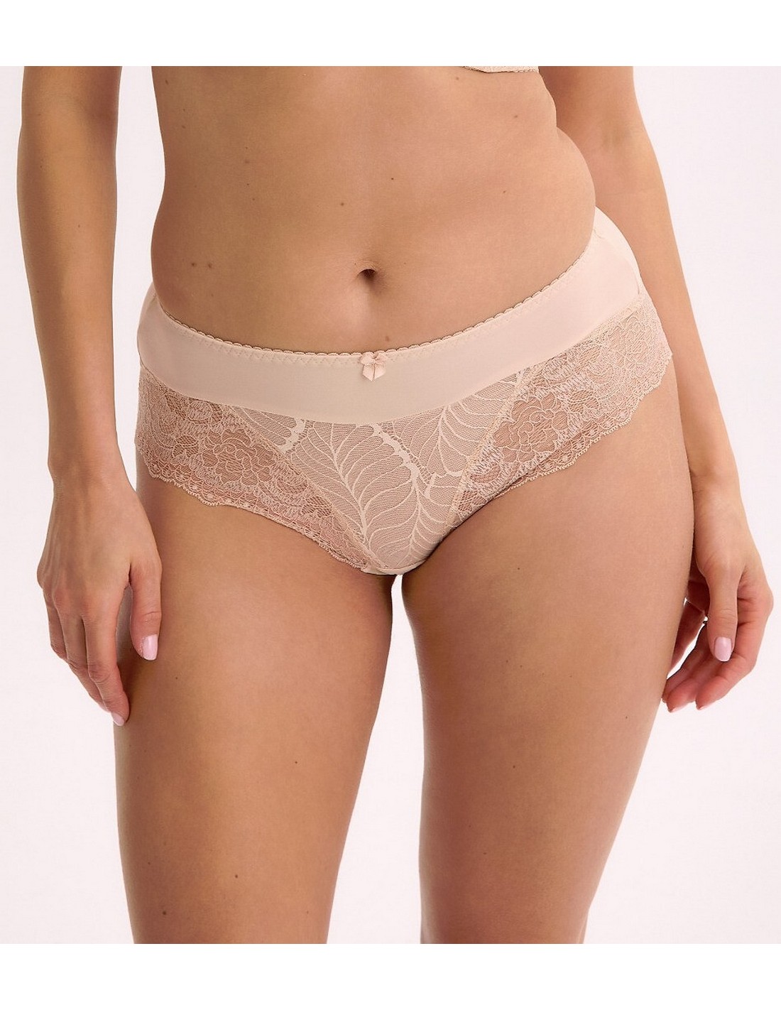Klasyczne figi z koronką to ponadczasowy wybór, który łączy elegancję, subtelność i wyjątkowy komfort użytkowania. Przód wykonany jest z transparentnej koronki o roślinnym wzorze, uzupełniony gładkim pasem, który podkreśla linię talii. Tył z gładkiej, elastycznej dzianiny zapewnia świetne dopasowanie i wygodę w każdej sytuacji. Wykończenia z delikatnej koronki w dolnej części dodają wdzięku i kobiecej lekkości. Figi w kolorze cielistym są dyskretne pod jasną odzieżą i znakomicie komponują się z biustonoszami z tej samej kolekcji.