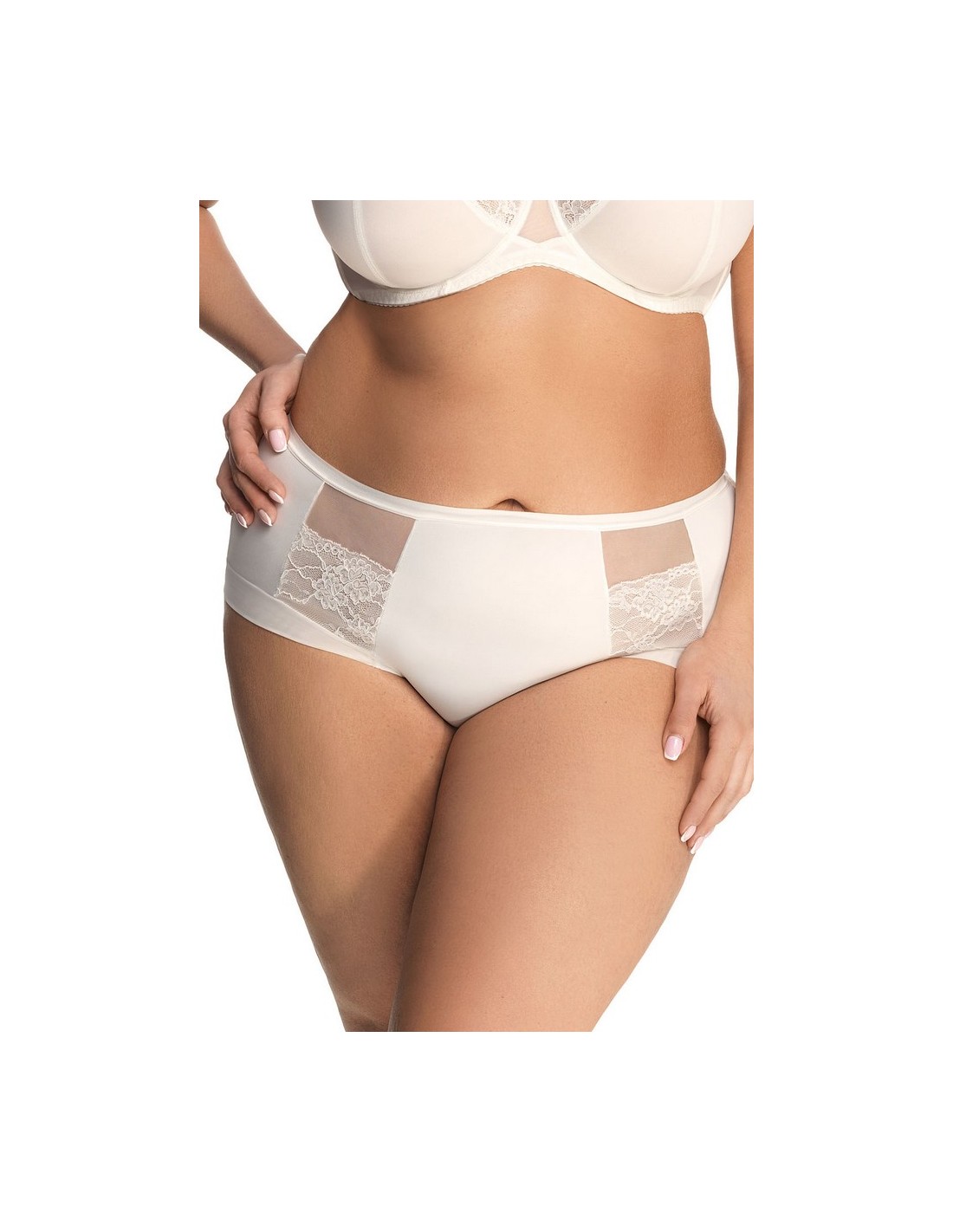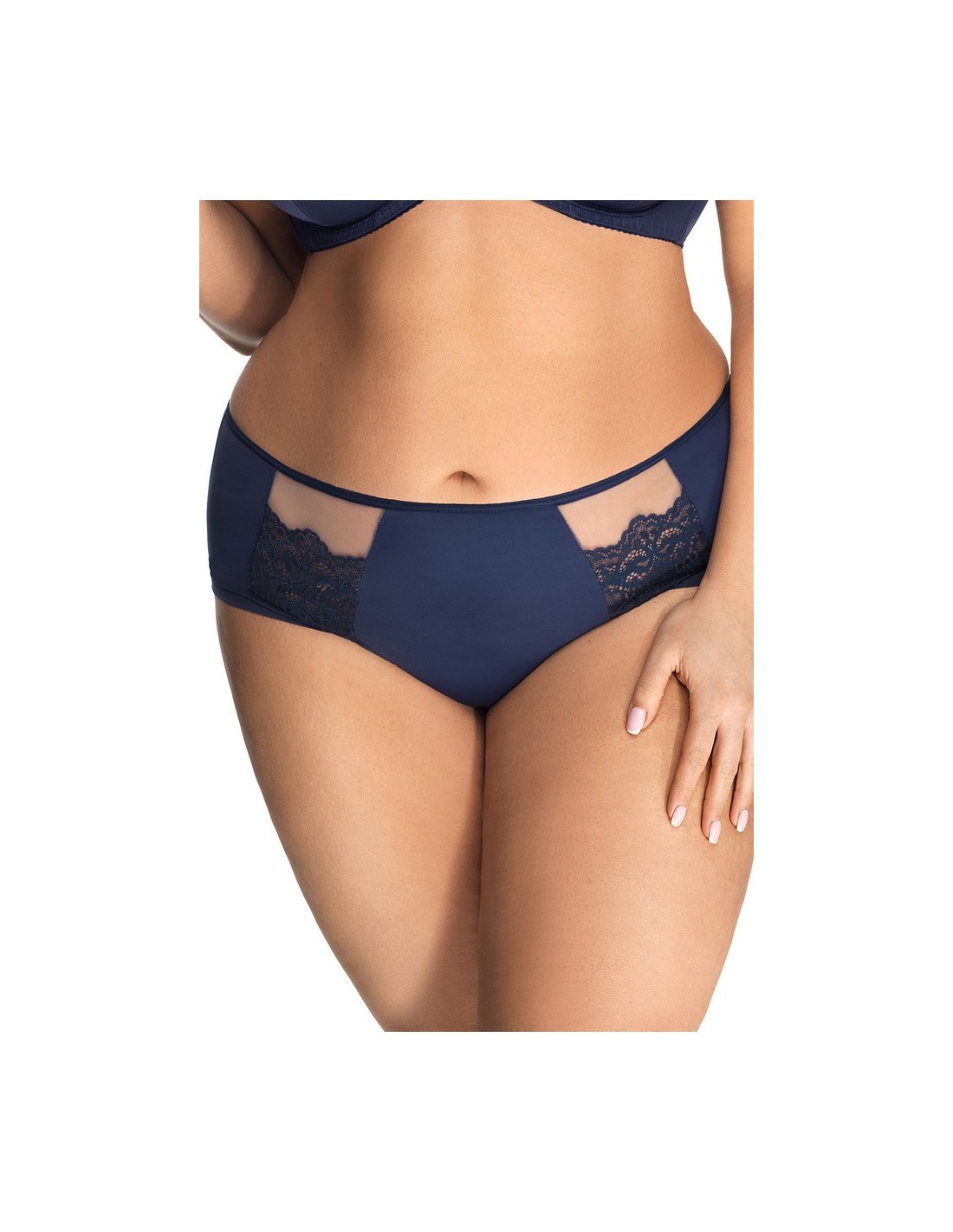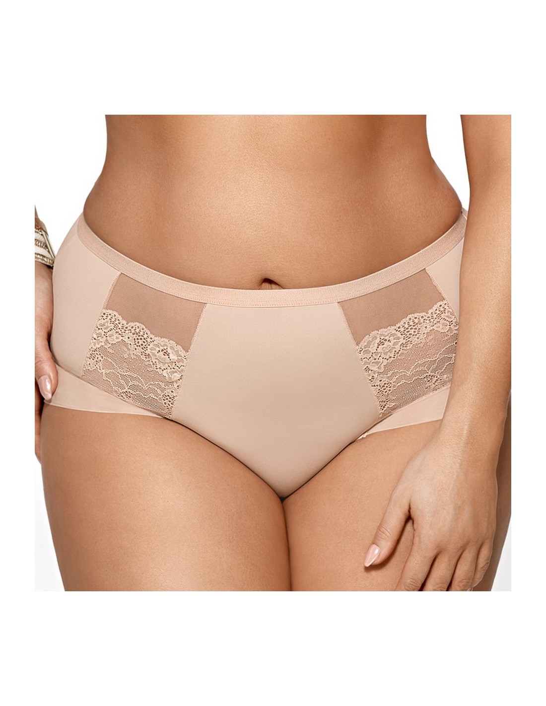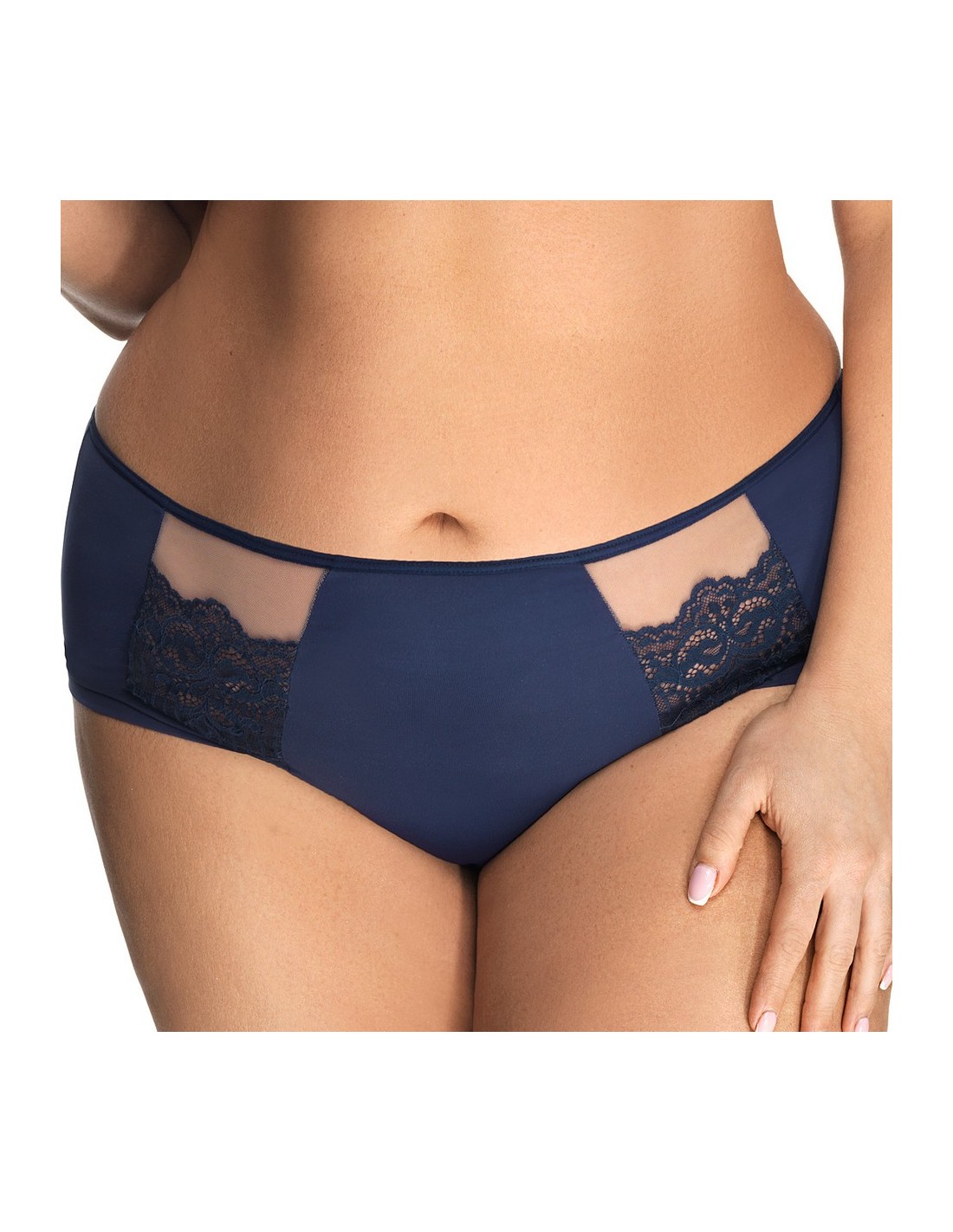 Szykowne figi damskie Gorsenia K442 Luisse o pełnym i nieco wyższym fasonie. Model zaprojektowany z gładkiej i miękkiej mikrofibry. Z przodu umieszczone dwie duże wstawki z prześwitującego tiulu, zdobionego subtelną koroneczką. Nogawki z podwójnie złożonego elastycznego tiulu. Figi Luisse pozwolą na ukrycie wszelkich niedoskonałości oraz pięknie podkreślą figurę.