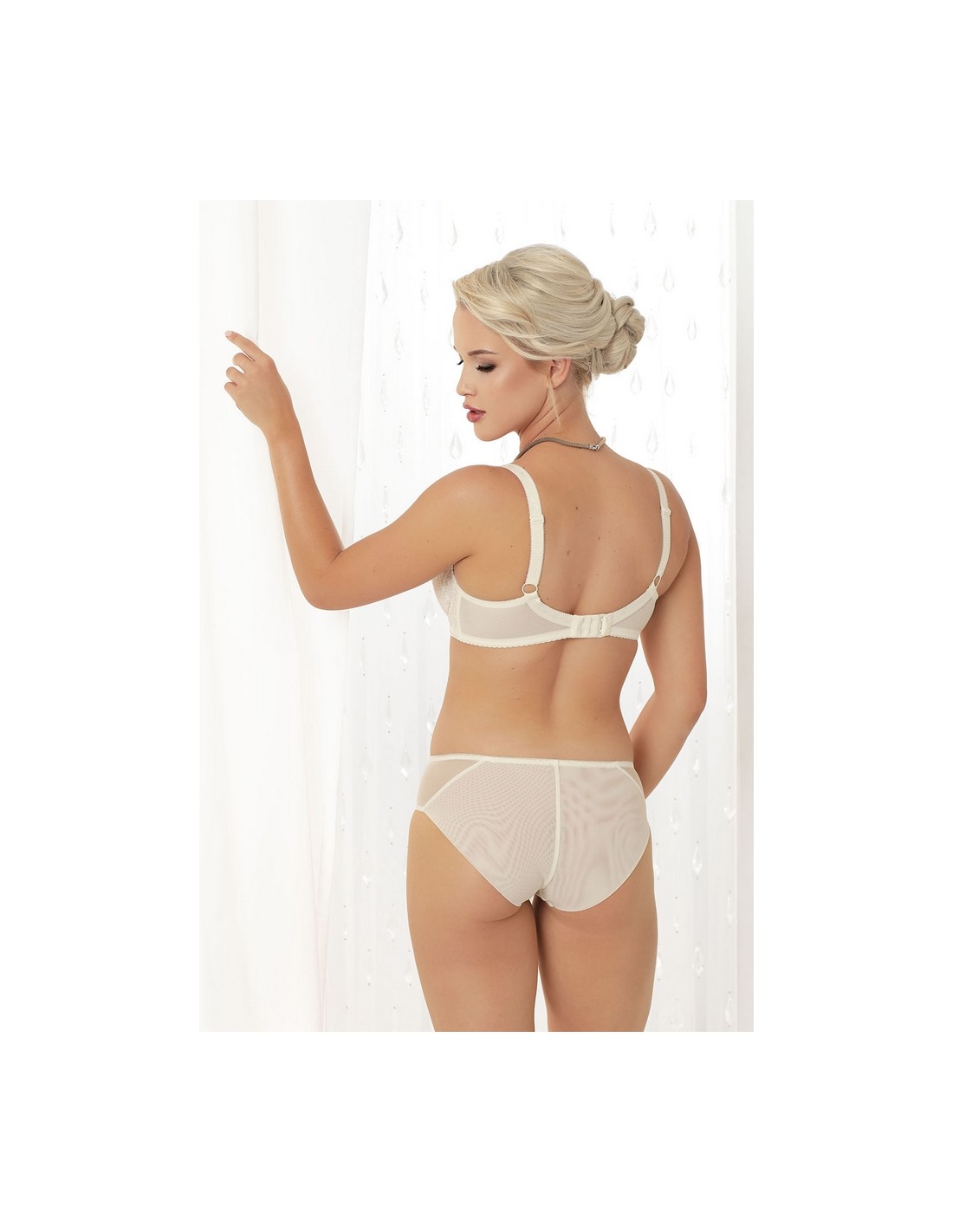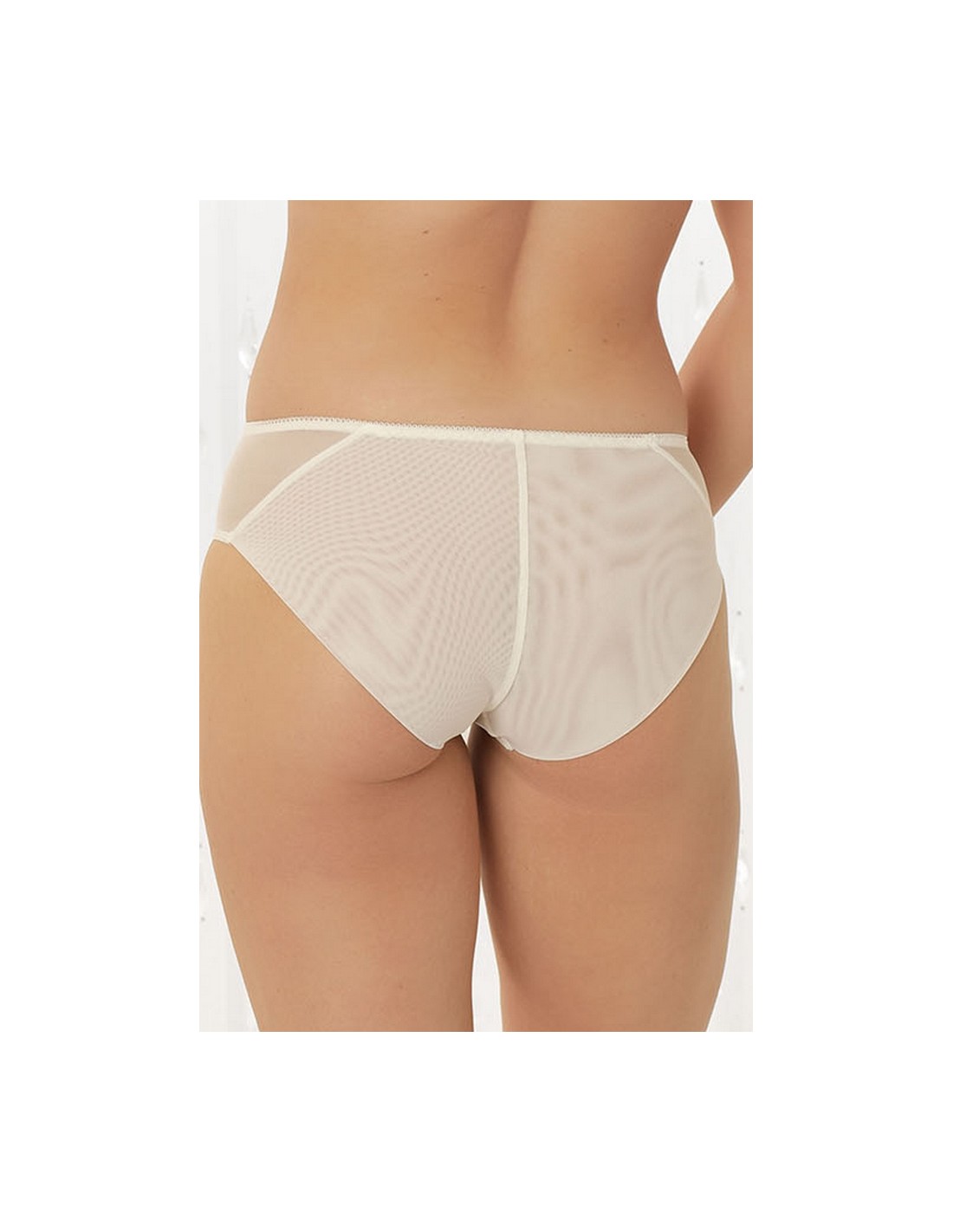 Figi o klasycznym kroju. Z przodu wykończone delikatnym haftem oraz materiałem Simplex. Tył wykonany jest z tiulu, który nie odznacza się pod odzieżą. świetnie dopasowują się do ciała. Kroczek wykończony bawełnianą wkładką.