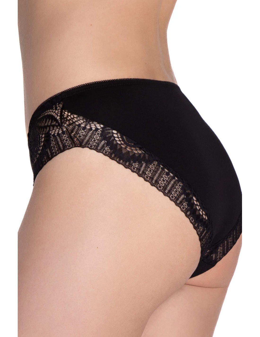 Figi LAMA to połączenie komfortu i ponadczasowej kobiecości. Wykonane z miękkiej, oddychającej tkaniny doskonale dopasowują się do ciała, zapewniając wygodę przez cały dzień. Po boczkach zdobi je efektowna, delikatna koronka o misternym wzorze, która dodaje figom elegancji i lekkości. Model świetnie prezentuje się zarówno w klasycznej czerni, jak i w subtelnym beżu. Wyśmienite jako element kompletu - tworzą harmonijną całość z dopasowanym biustonoszem LAMA.