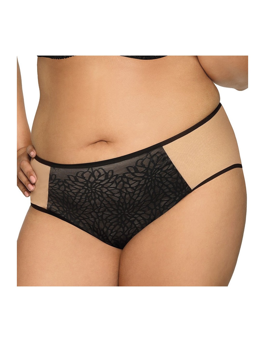 Przód wykonany z delikatnej koronki w odcieniu głębokiej czerni, natomiast tył z beżowej, gładkiej tkaniny, co zapewnia dyskrecję i komfort noszenia. Nogawki wykończone są podwójną siateczką, co dodaje subtelności. Skład materiału: 91% poliamid, 5% bawełna, 4% elastan, co gwarantuje elastyczność i trwałość.