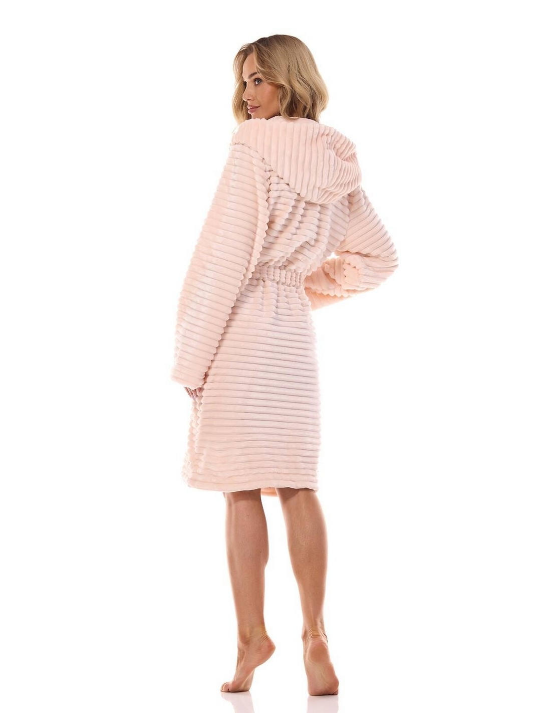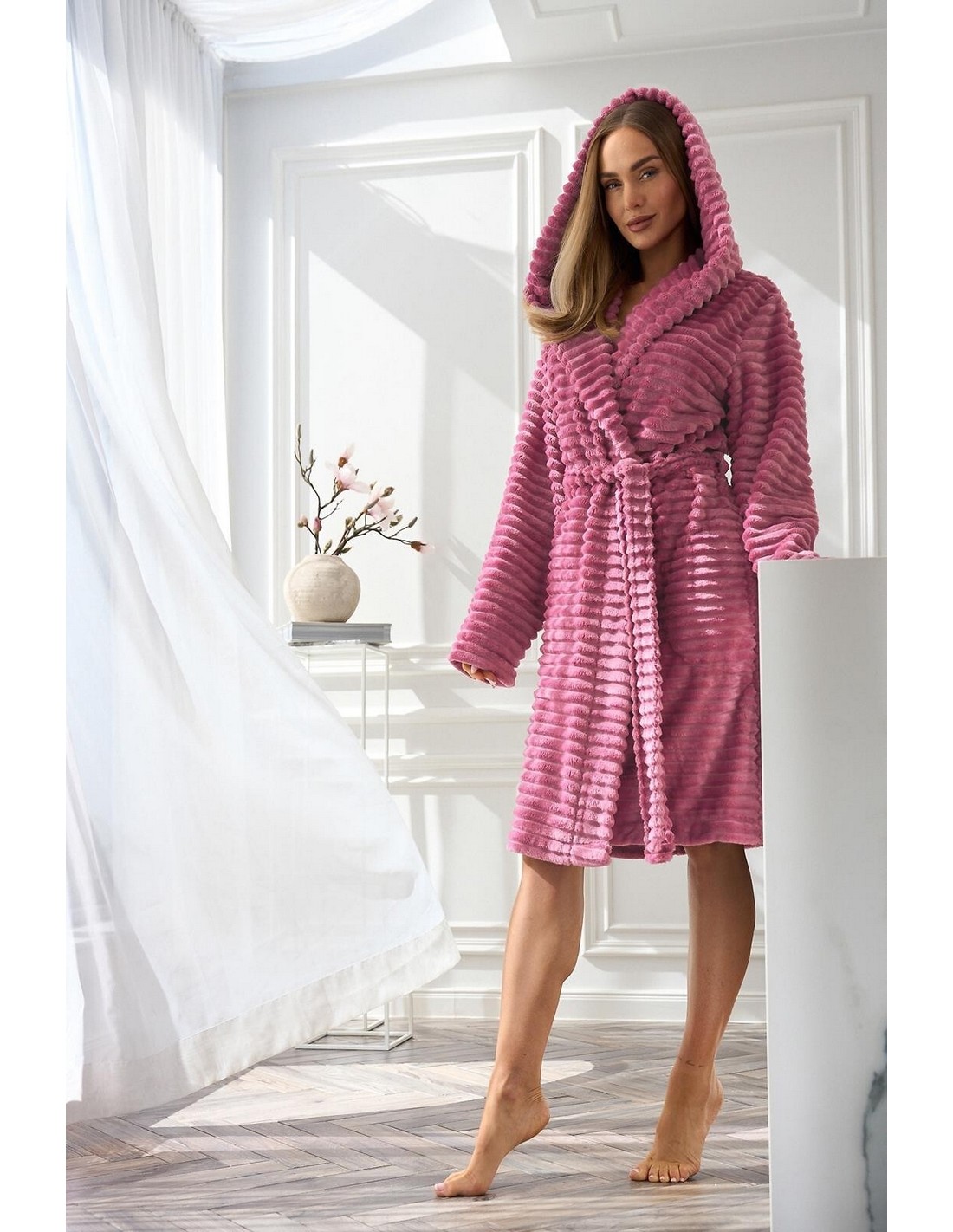 Ten różowy szlafrok damski L&L Robin 2416 charakteryzuje się grubym, miękkim materiałem, który doskonale sprawdzi się w chłodne wieczory. Jego faktura z poziomymi, wypukłymi pasami nadaje mu elegancki wygląd. Długi rękaw oraz kaptur zapewniają dodatkowe ciepło i komfort, a wiązanie w pasie pozwala na idealne dopasowanie. Szlafrok wyposażony jest w kieszenie, co zwiększa jego funkcjonalność. To idealny wybór na relaks w domowym zaciszu lub jako uzupełnienie bielizny nocnej.