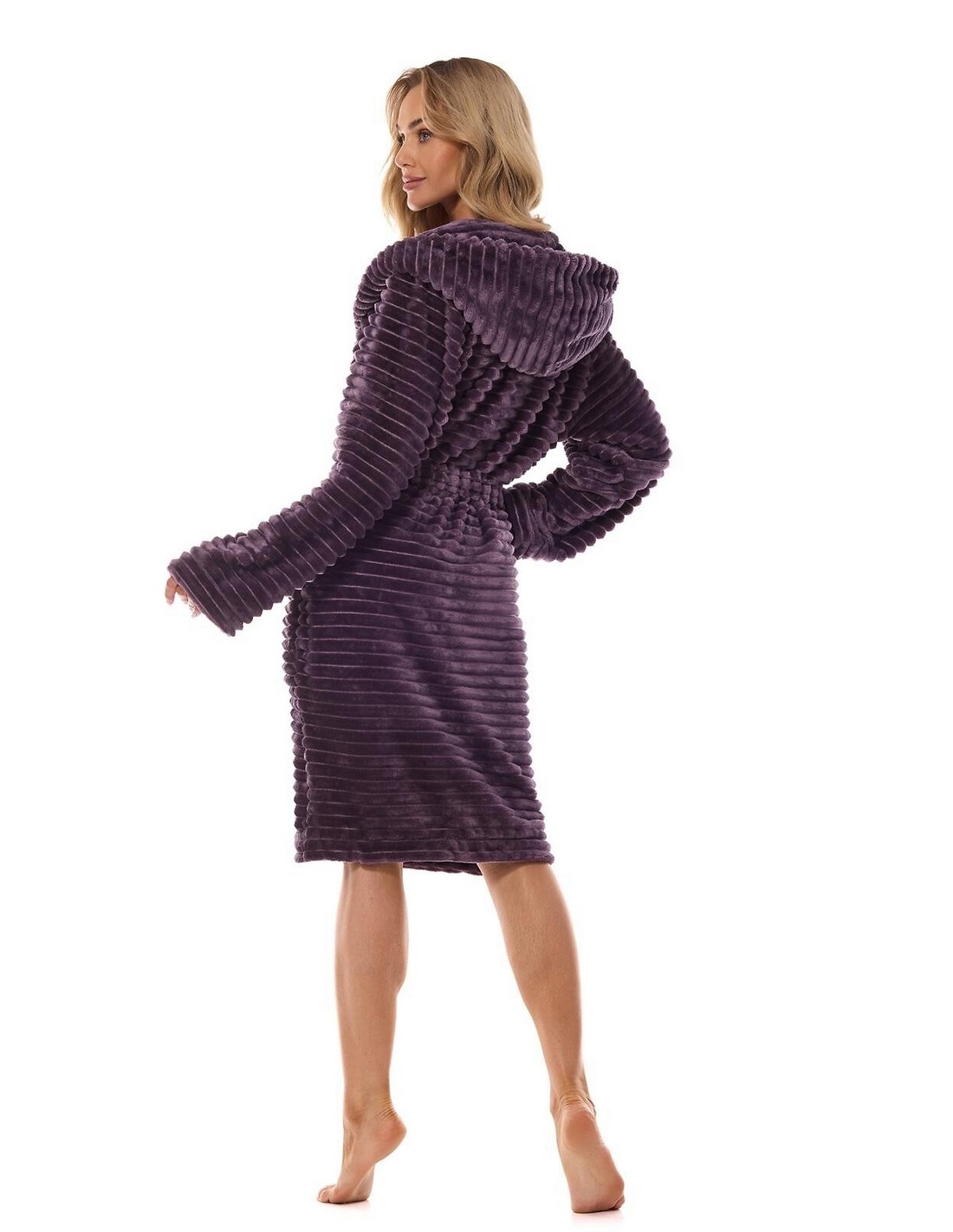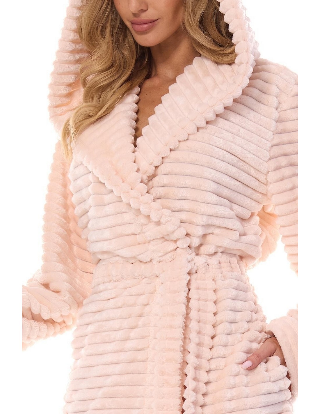 Ciepły szlafrok damski L&L Robin 2416 posiada długi rękaw oraz kaptur, co dodatkowo podkreśla jego funkcjonalność. Wykonany z miękkiego materiału, zapewnia komfort i ciepło.