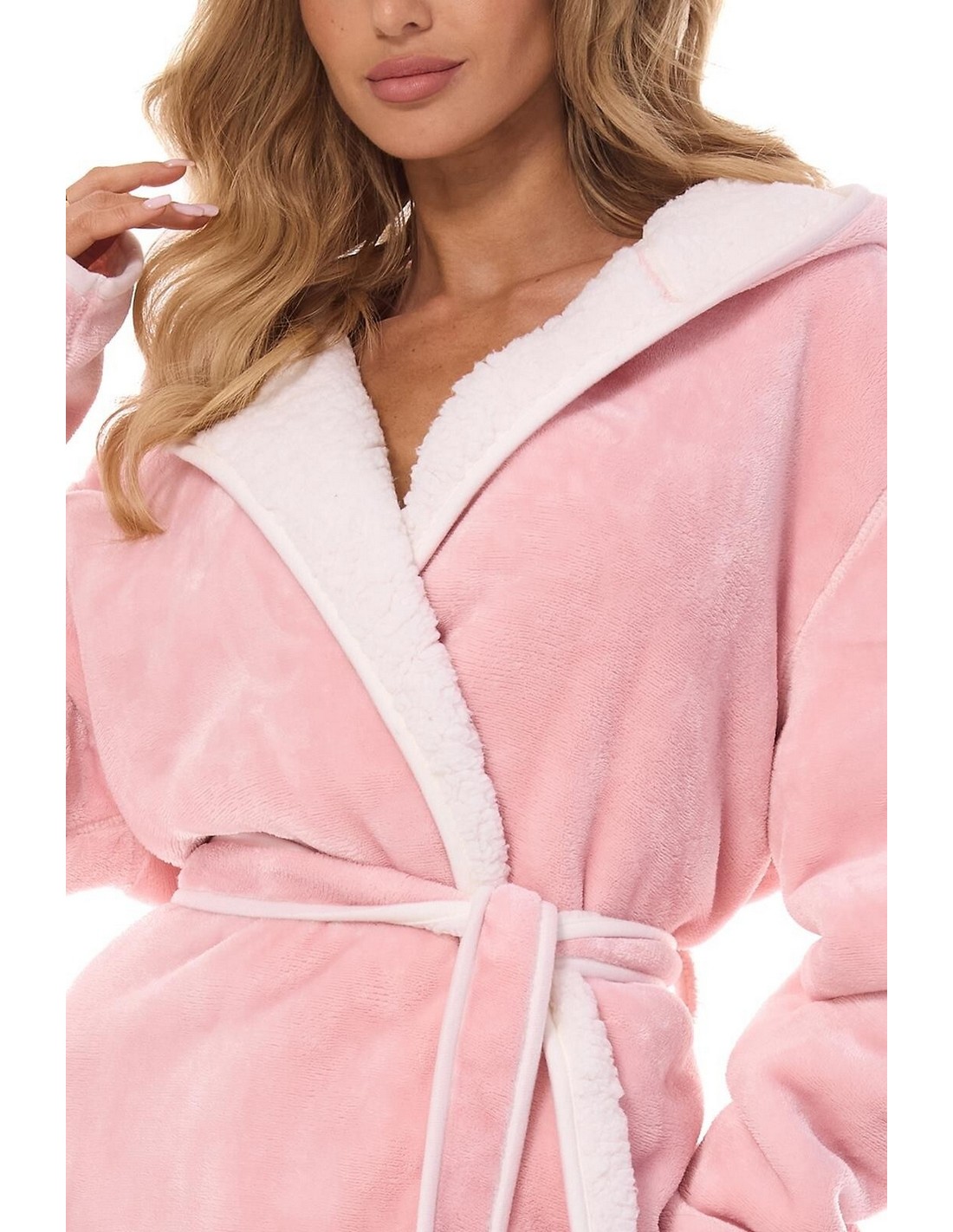 Gruby szlafrok damski Sara 2417 L&L wykonany jest z miękkiej dzianiny, która zapewnia ciepło i wygodę. Posiada kaptur, długie rękawy oraz praktyczne kieszenie, co czyni go funkcjonalnym wyborem na każdą porę roku. Wiązany w pasie, idealnie dopasowuje się do sylwetki. Wnętrze podszyte jest białym, puchatym futerkiem, co podnosi komfort noszenia. Sprawdzi się doskonale podczas relaksu w domowym zaciszu oraz na chłodne wieczory.