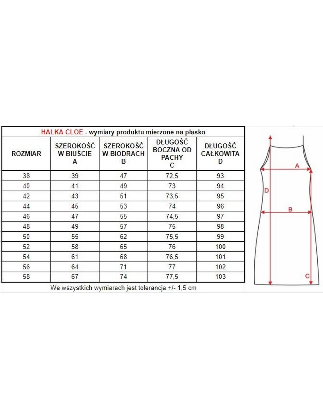 Halka CLOE to halka na grubych ramiączkach z elastycznej koronki, z długością przed kolano. Halka została uszyta z naturalnej dzianiny i wyśmienicie sprawdzi się jako dodatek do noszenia pod sukienki, tuniki, jako koszula nocna do spania, czy kostium typu homewear do chodzenia po domu. Halka CLOE występuję w 3 kolorach, które Wyśmienicie sprawdzą się pod ubrania w różnych kolorach.