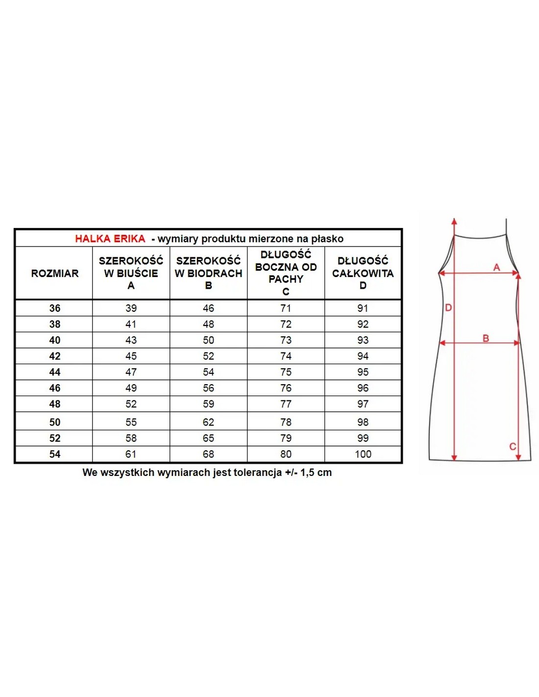 Erika to elegancka, gładka halka o klasycznym kroju na regulowanych ramiączkach. Ma delikatne zaszewki na wysokości biustu, dzięki czemu wyśmienicie układa się pod ubraniem, pozostając dyskretna i niewidoczna.