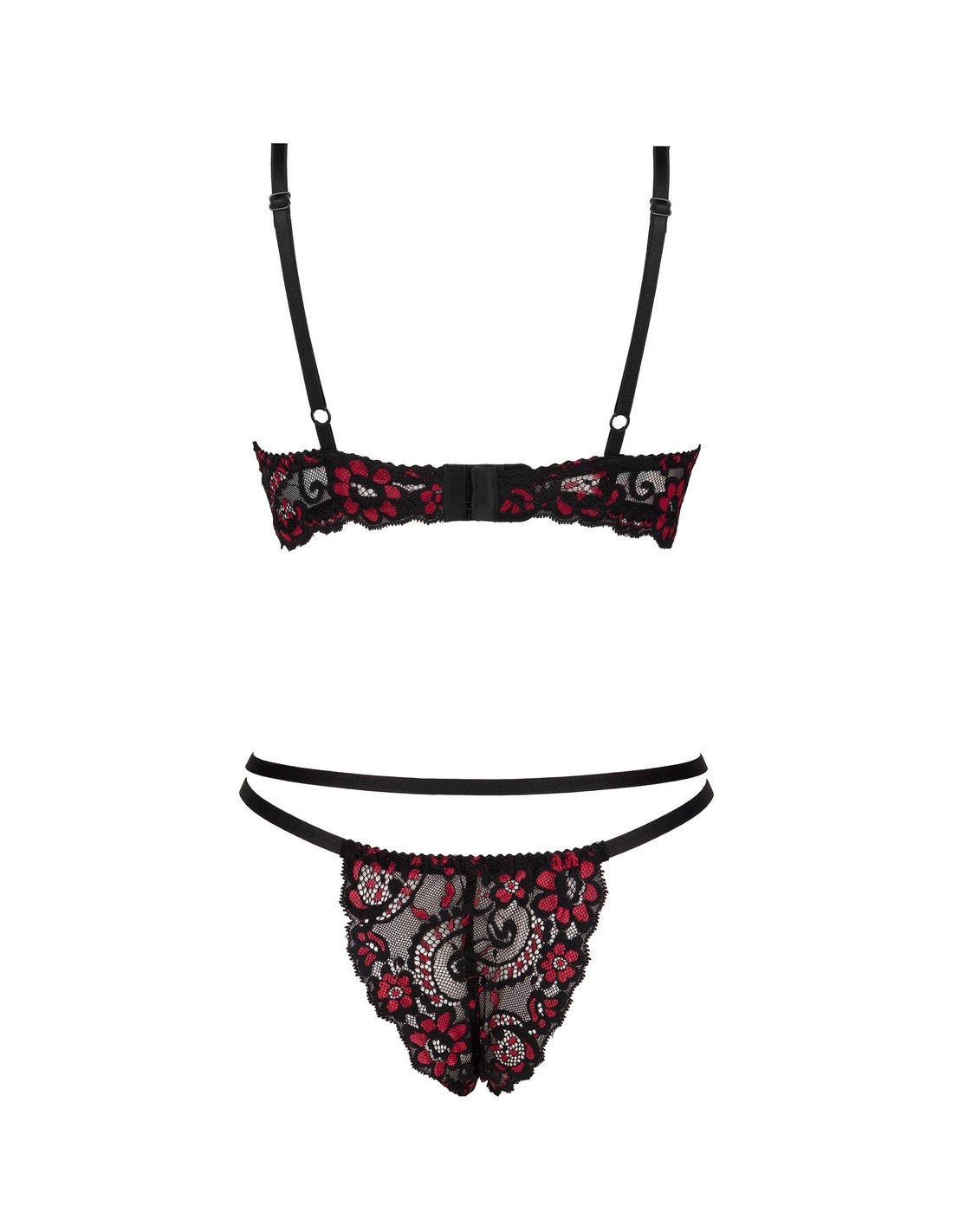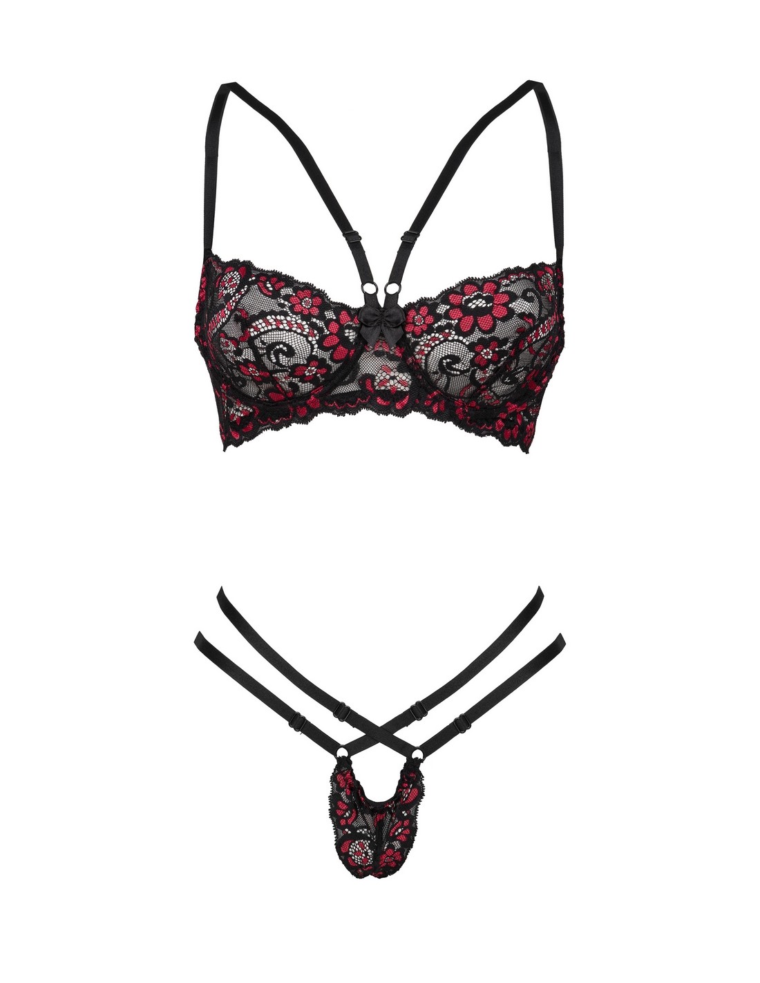 Komplet wykonany z czarnej koronki z czerwonymi połyskującymi kwiatami. Stanik posiada regulowane ramiączka i pięknie eksponuje dekolt.