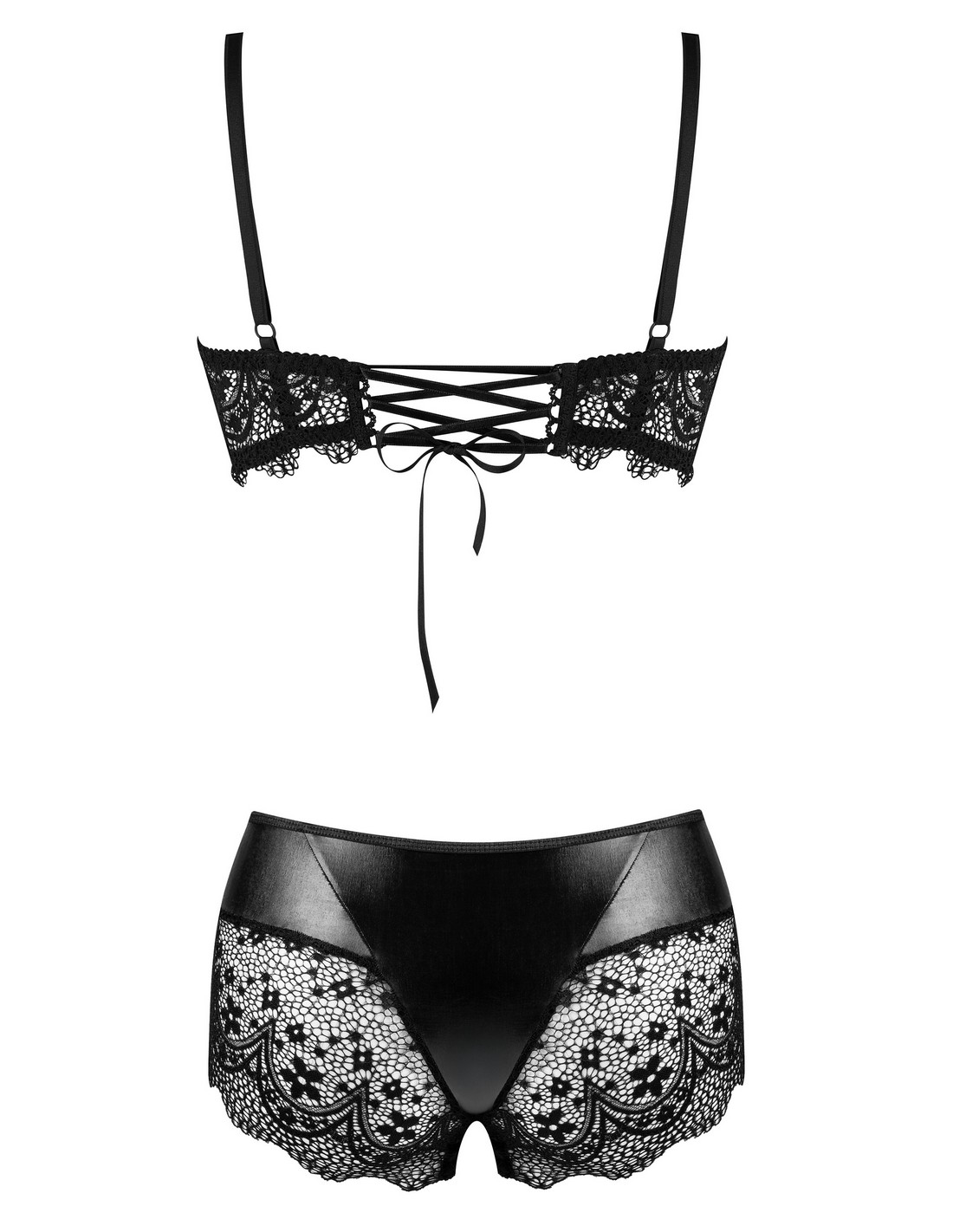• Luksusowy materiał: Połączenie delikatnych koronek i błyszczącego materiału nadaje kompletowi wyjątkowego charakteru, łącząc elegancję z nutą drapieżności.