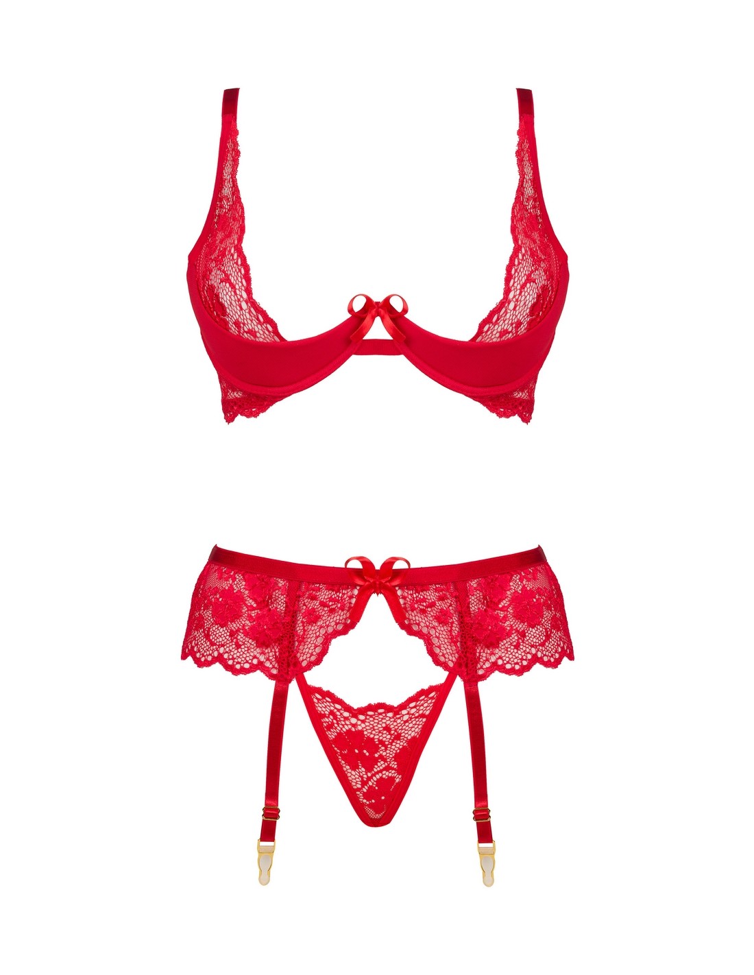 Poznaj sexowny komplet bielizny Rose set red, który obejmuje biustonosz, stringi oraz pas do pończoch. Ten uwodzicielski komplet, wykonany jest z delikatnej koronki w intensywnym czerwonym kolorze, podkreśli Twoje naturalne piękno i sprawi, że poczujesz się rewelacyjnie kobieco i seksownie.
