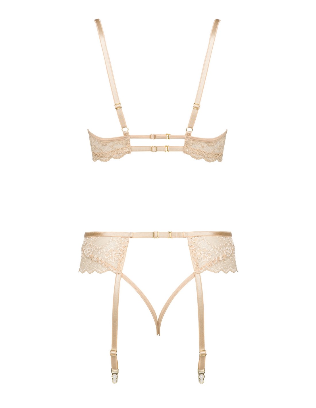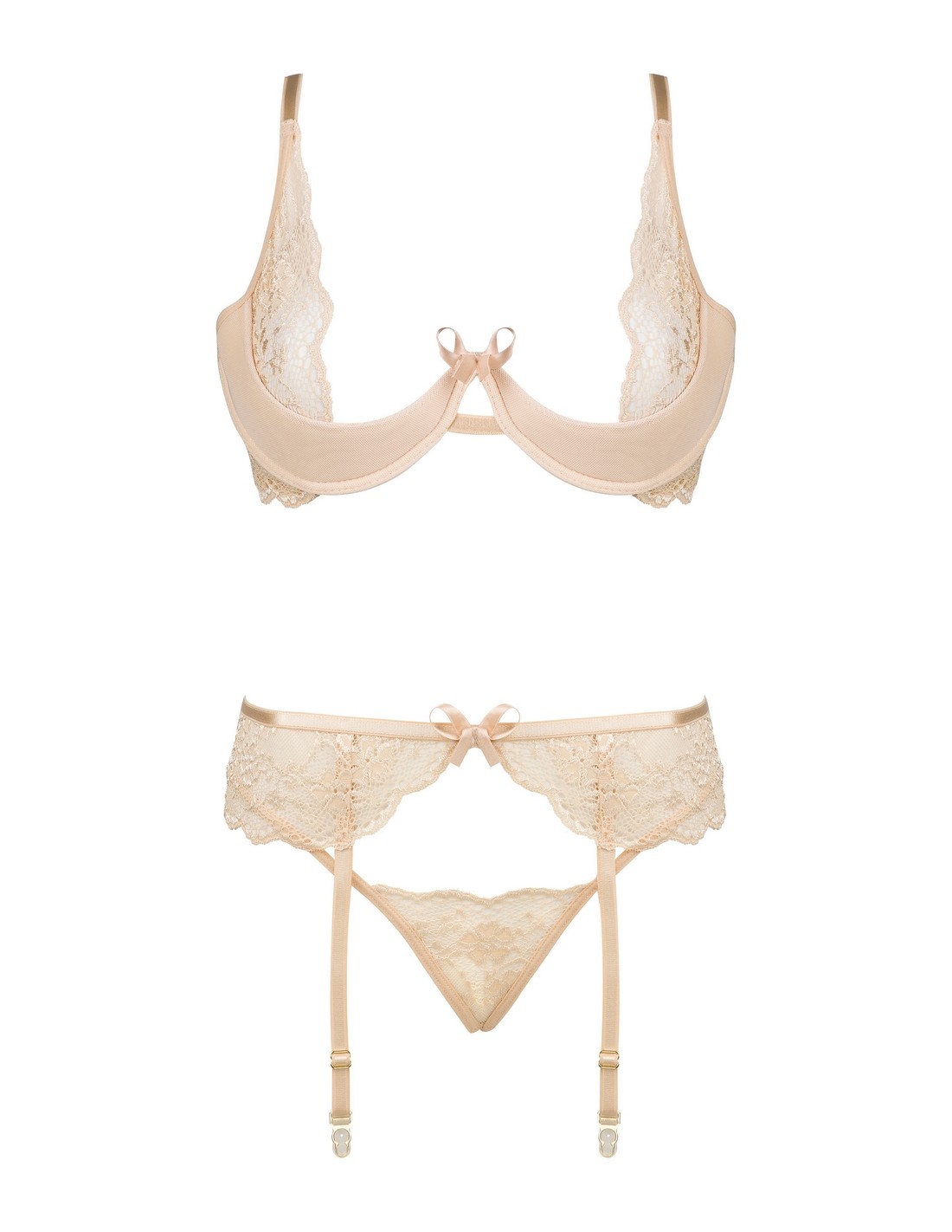 Poznaj wyjątkowy zestaw bielizny Rose set Nude, który obejmuje stanik, stringi oraz pas do pończoch. Ten subtelny i szykowny komplet, wykonany z delikatnej koronki w odcieniu nude, podkreśli Twoje naturalne piękno i doda pewności siebie w każdej sytuacji.