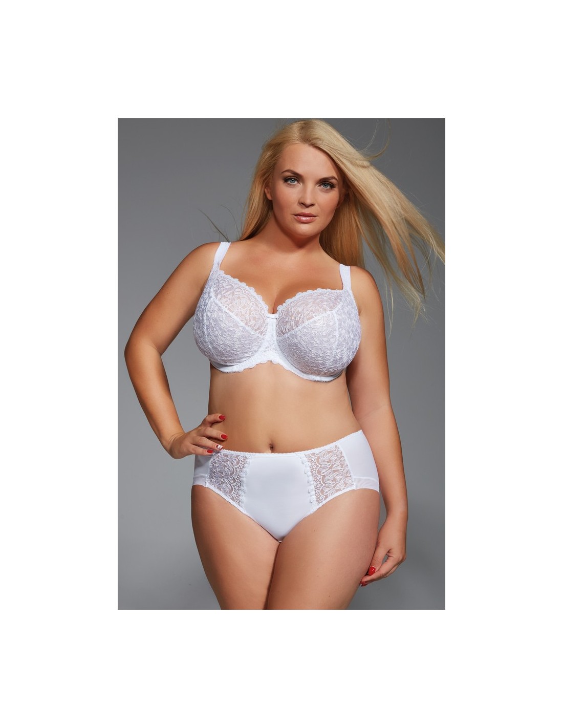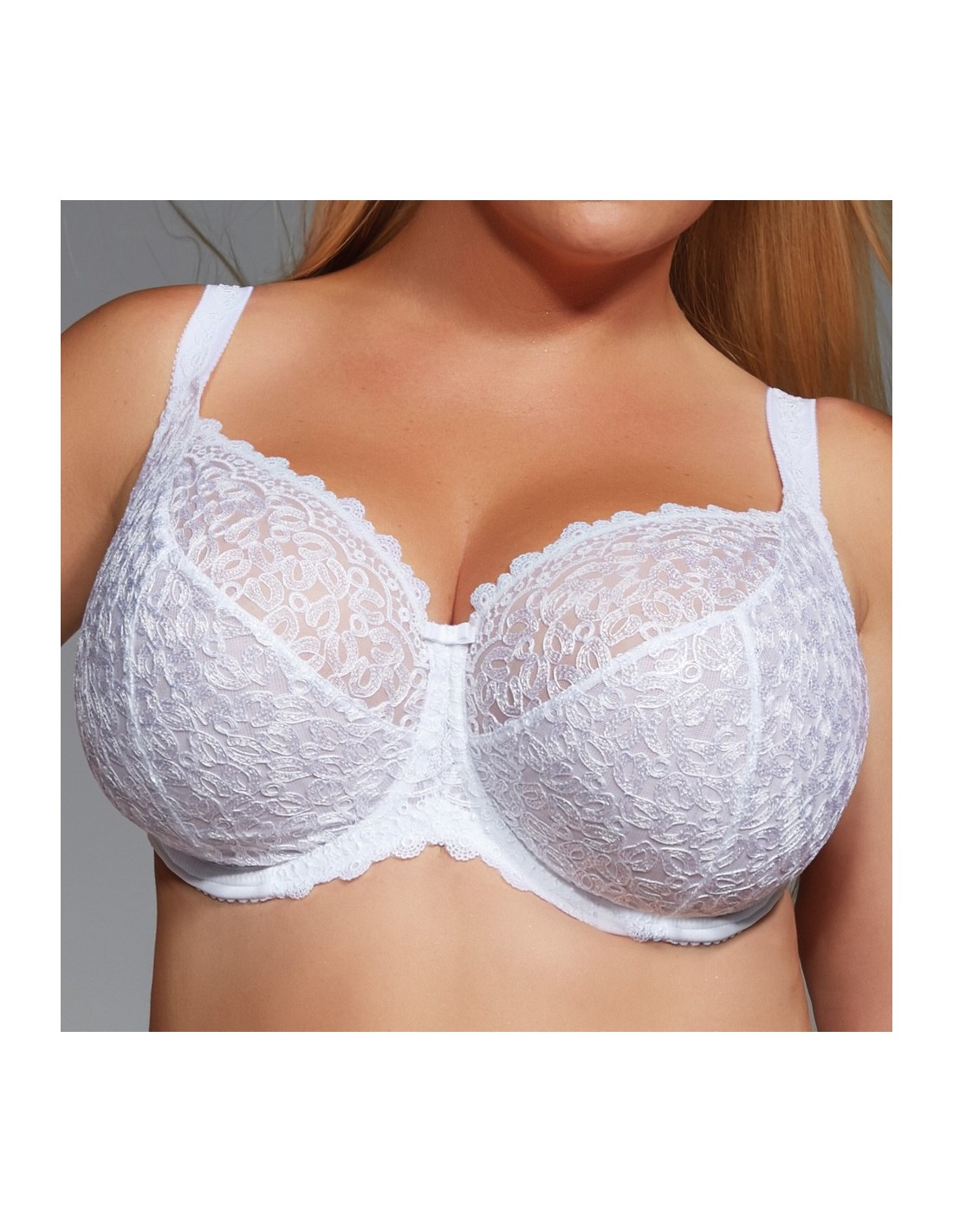 Stanik Betty swoim krojem gwarantuje komfort i wygodę noszenia Paniom o obfitym biuście. Biustonosz miękki, na fiszbinach perfekcyjnie zbiera biust do środka. W górnej części jest prześwitujący, dół natomiast wzmocniony stabilnym szyfonem. Boczki biustonosza wzmocnione pionowymi fiszbinami. Ramiączka nieodpinane, regulowane na całości o szerokości dopasowanej do rozmiaru miski. Biustonosz Betty zachwyca delikatnością i wykonaniem.