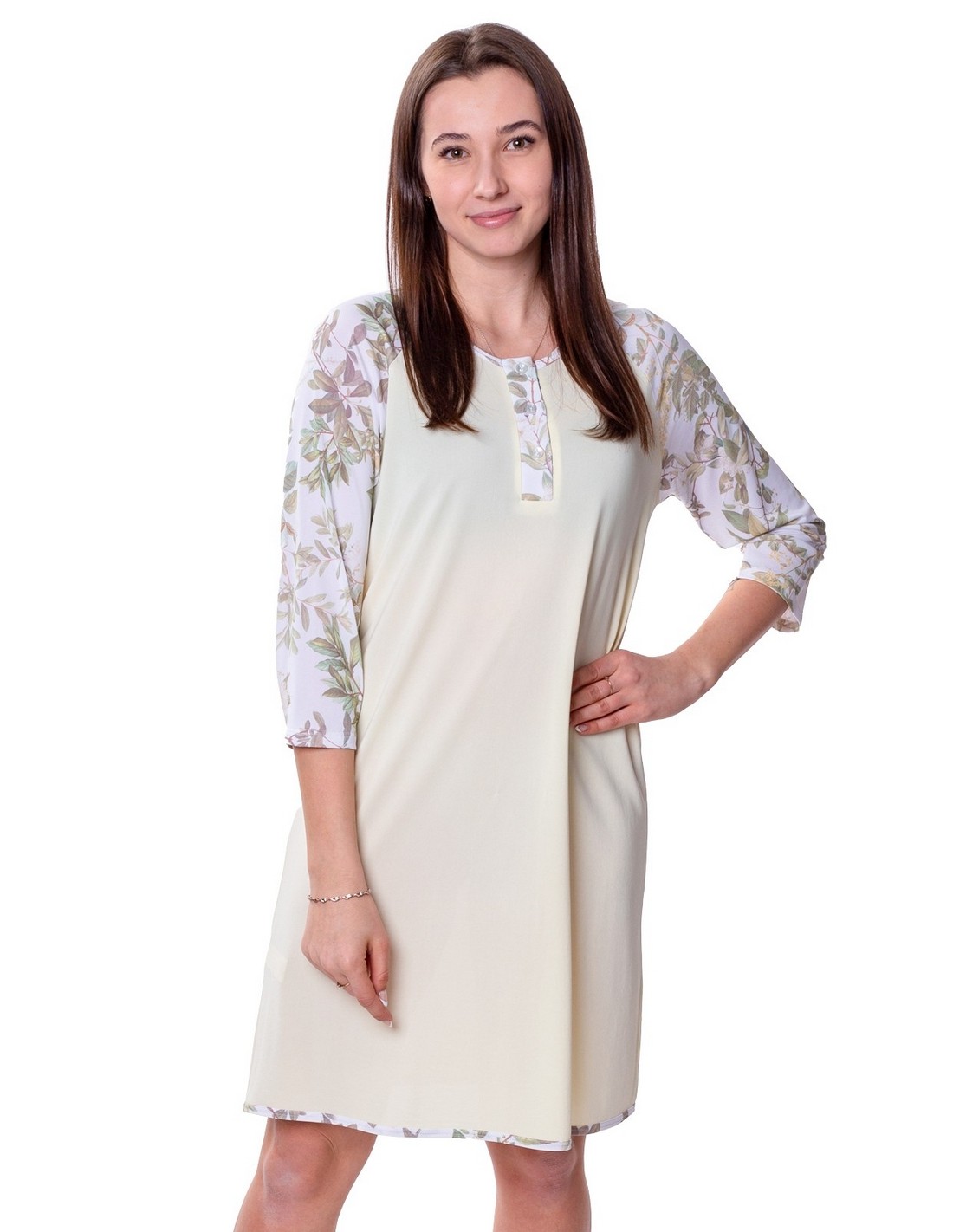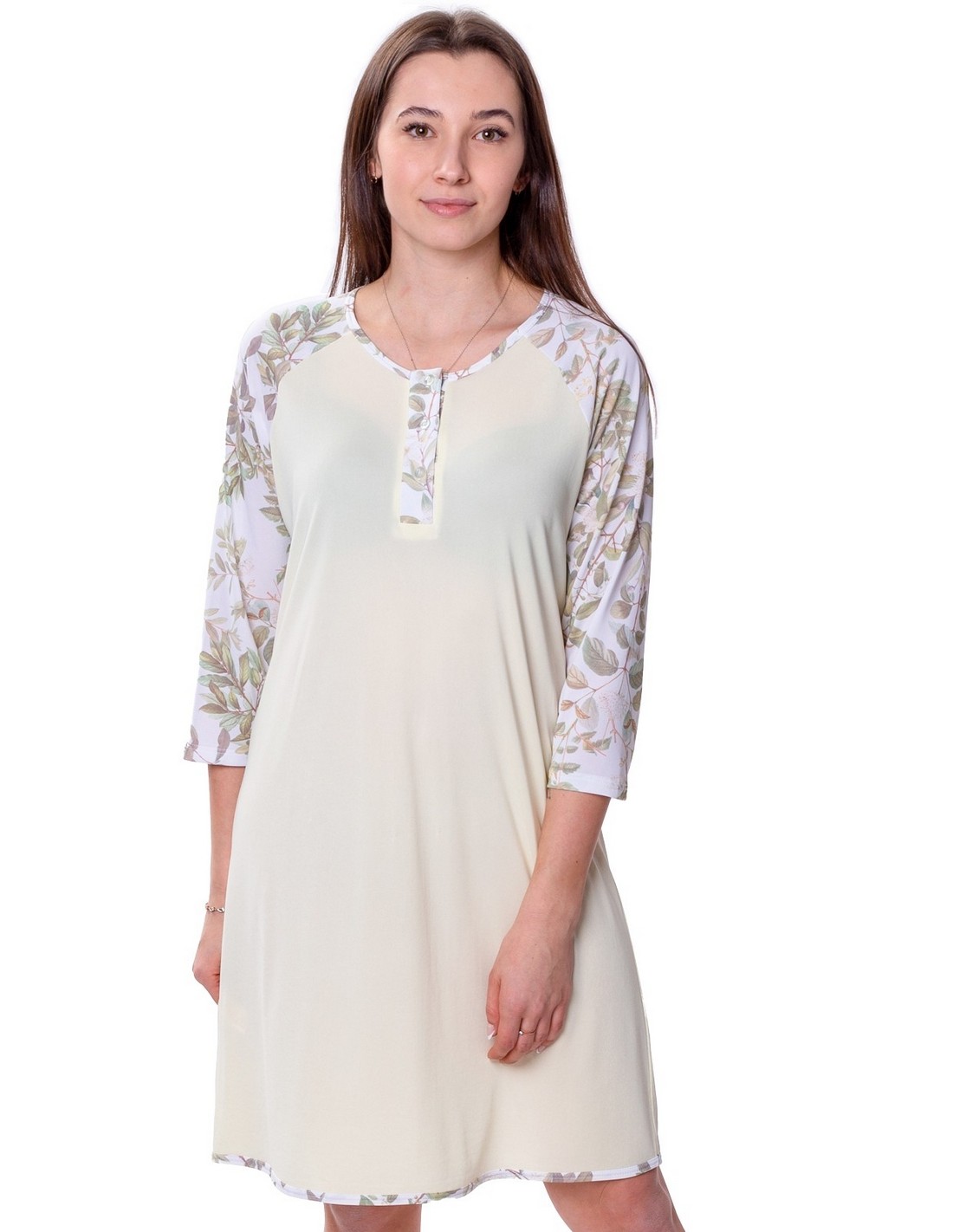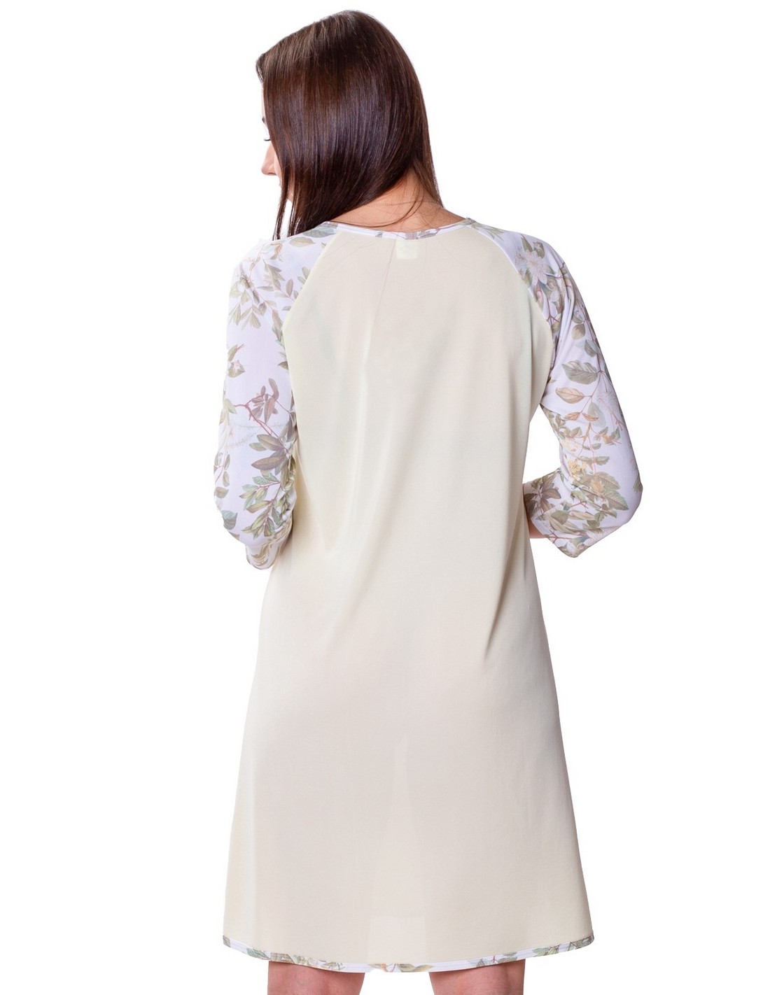 Rękawy zostały stworzone z koordynatu - gładkiej dzianiny w kolorze kremowym pasującym do nadruku. Koszula posiada rękawy 3/4, co sprawia, że jest idealna dla Pań o różnej długości ramion. Koszula sięga kolan, a jej długość uzależniona jest od wzrostu, co czyni ją uniwersalną.