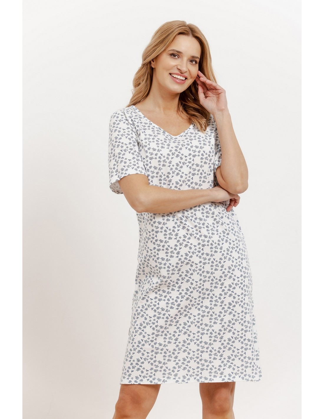 Koszula charakteryzuje się delikatnym kwiatowym printem, który dodaje jej kobiecego uroku. Krótki rękaw oraz półokrągły dekolt gwarantują wygodę i swobodę ruchów, a długość przed kolano sprawia, że model ten doskonale sprawdzi się zarówno jako casualowy strój domowy, jak i komfortowa koszula nocna.