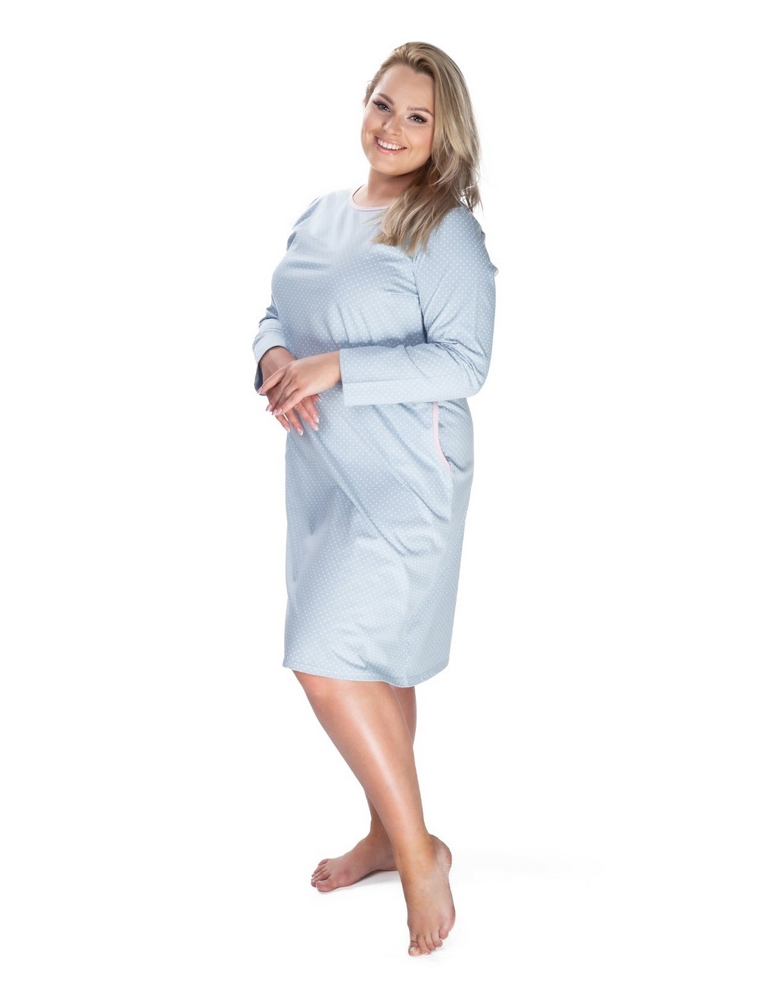 Koszula GOOD NIGHT posiada praktyczne, zakamuflowane kieszonki, które przydadzą się na drobne przedmioty takie jak chusteczki czy zapalniczka np. w trakcie pobytu w szpitalu. Koszula ma wzór w bardzo drobne, białe kropeczki na szarym tle. Jest bardzo ciepła, miękka i przyjemna w użytkowaniu. Dzięki temu, że ma formę litery A sprawdzi się w czasie ciąży lub będzie doskonała dla Pań, które chcą zamaskować pewne mankamenty ciała.