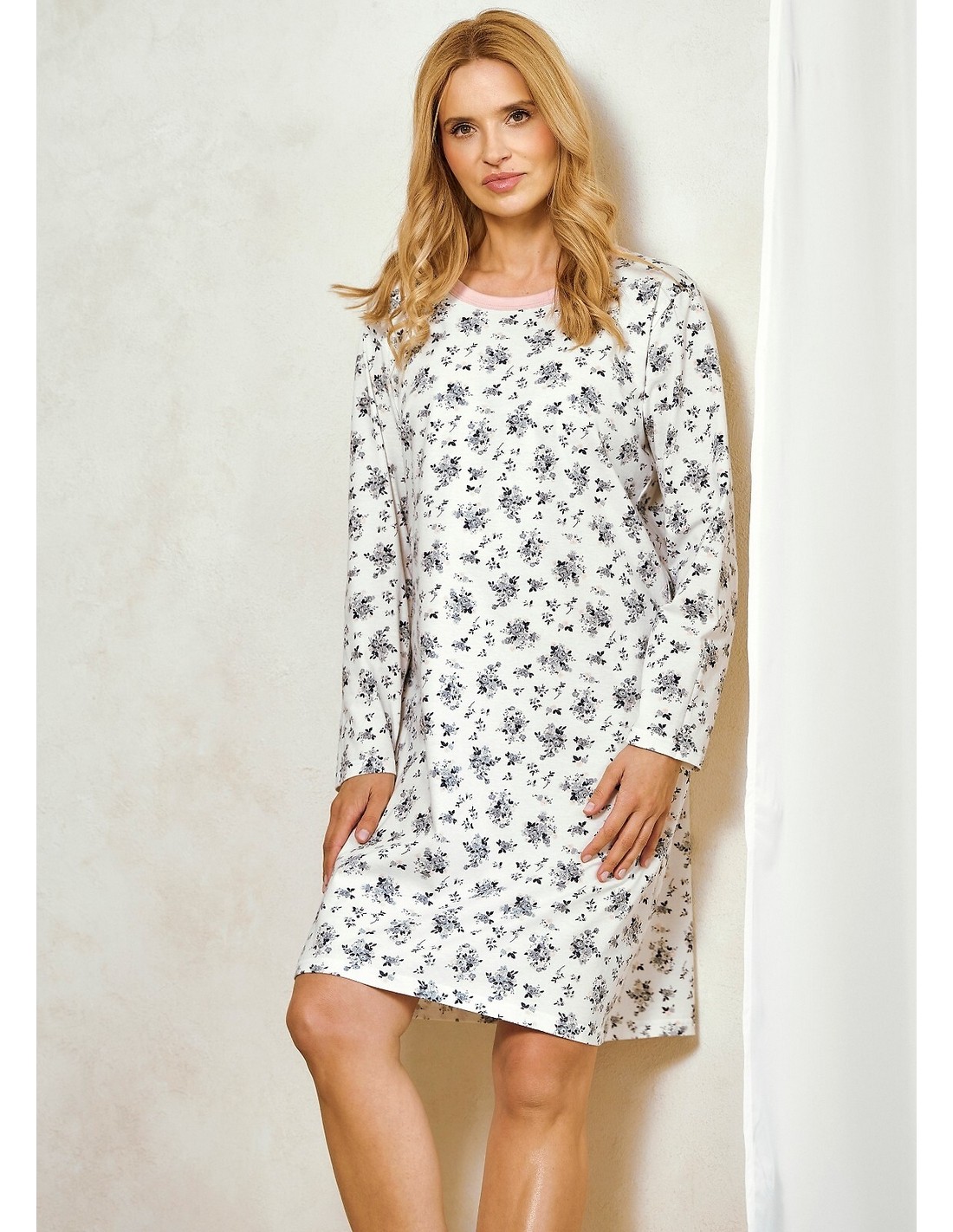 Koszula nocna Martina 3452 marki Taro to klasyka w eleganckim wydaniu. Uszyta z wysokiej jakości, wzorzystej bawełny, gwarantuje komfort termiczny, przewiewność i przyjemne uczucie na skórze. Model posiada długi rękaw, okrągły dekolt starannie obszyty lamówką oraz długość sięgającą do kolan. Luźny, wygodny krój sprawia, że koszula perfekcyjnie sprawdzi się zarówno na chłodniejsze noce, jak i jako codzienna bielizna nocna dla pań ceniących klasyczny styl i komfort.