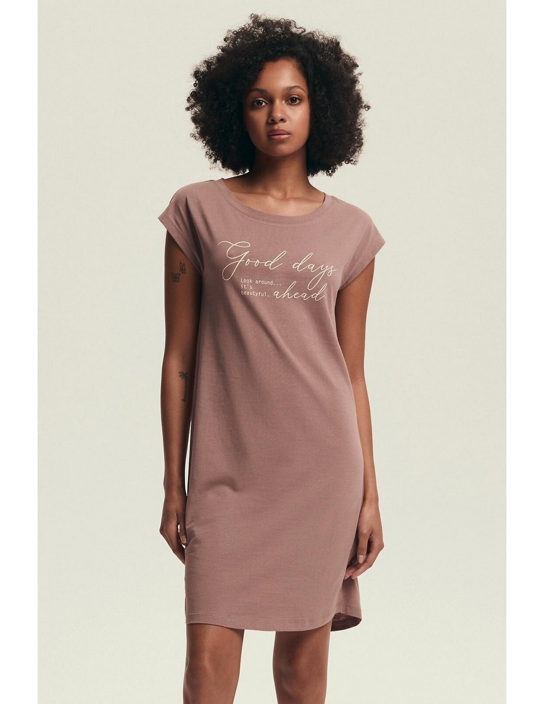 Na froncie znajduje się inspirujący nadruk z przesłaniem "Good days ahead", który dodaje pozytywnej energii na każdy wieczór i poranek. Kobiecy krój z zaokrąglonym dołem oraz krótkimi rękawkami gwarantuje swobodę ruchów i wygodę noszenia, znakomitą na każdą porę roku.