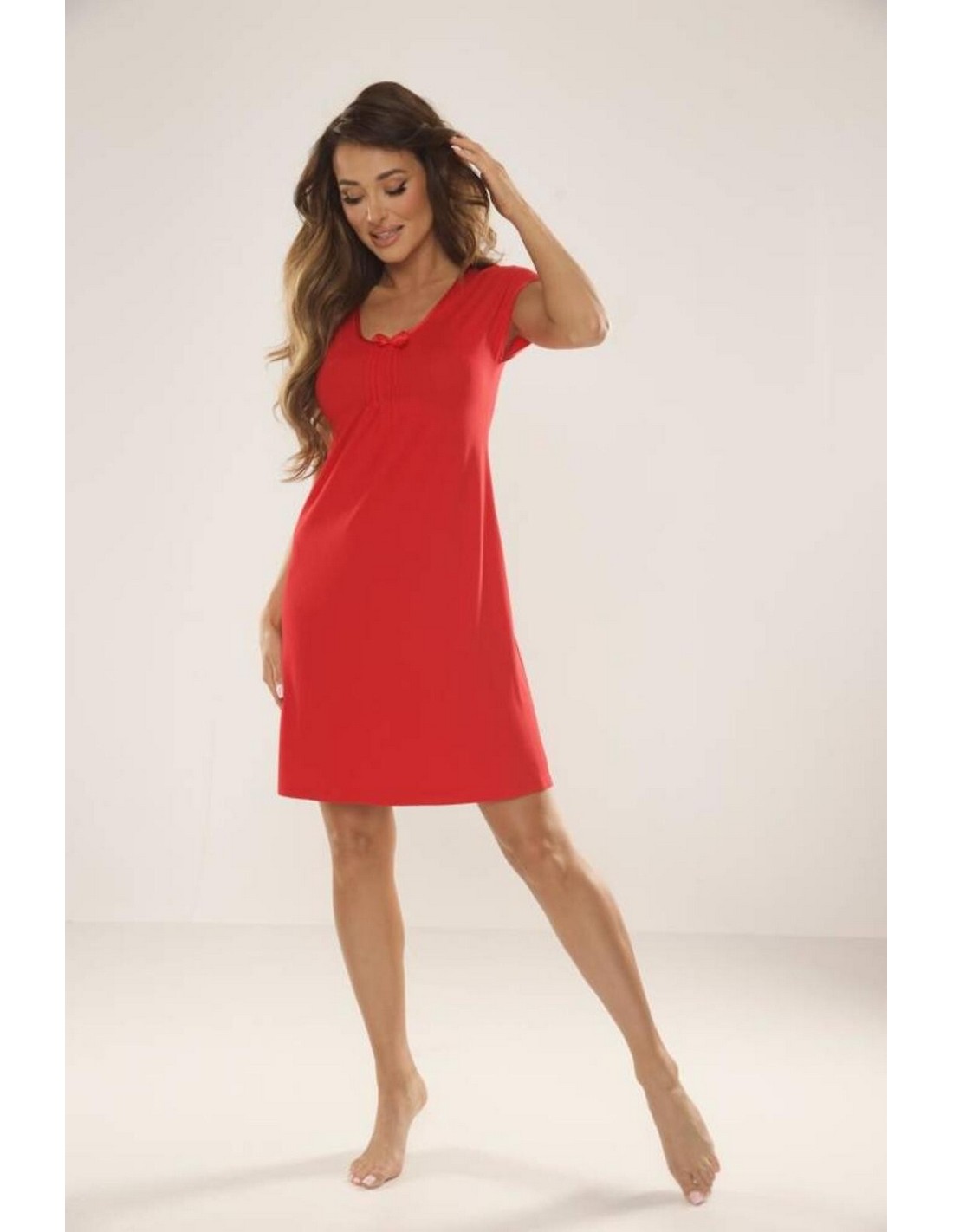 Wygodna koszulka nocna z krótkim rękawem o długości przed kolano. Wykonana jest z elastycznej, przyjemnej wiskozowej dzianiny, nieco pomarszczonej w okolicy biustu. Mostek ozdobiono uroczą kokardką. Koszulka na rękawkach oraz w okolicy dekoltu wykończona wąską, połyskującą lamówką.