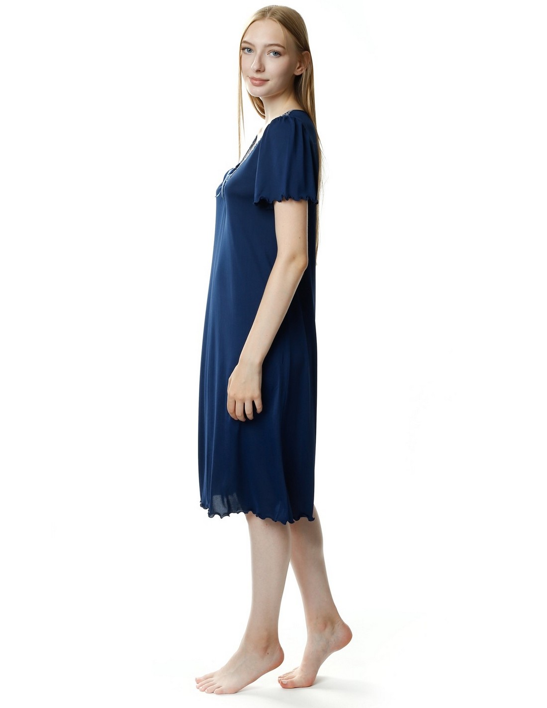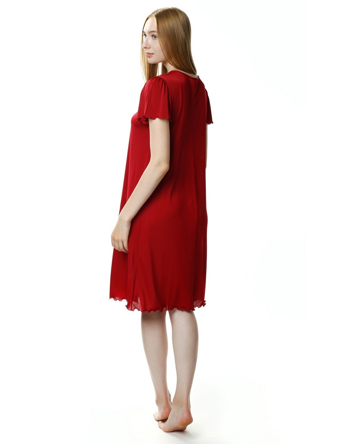 Koszula nocna DORIS to nonszalancki krój w kształcie litery "A", długość do kolan oraz dekolt w kształcie litery "v" ozdobiony piękną, romantyczną koronką. Dodatkowo rękawy i dół koszuli wykończony jest ozdobnym szwem.